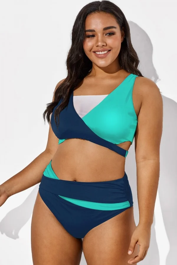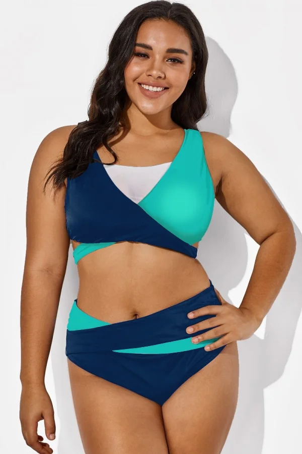 Plus Size Round Neck Black Patchwork Bikini Top