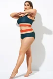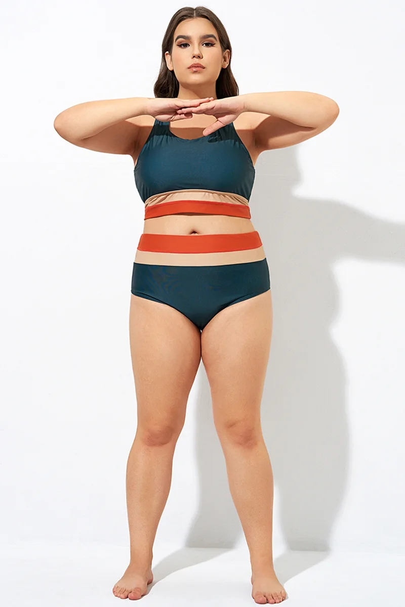 Plus Size Round Neck Black Patchwork Bikini Top