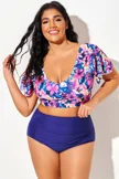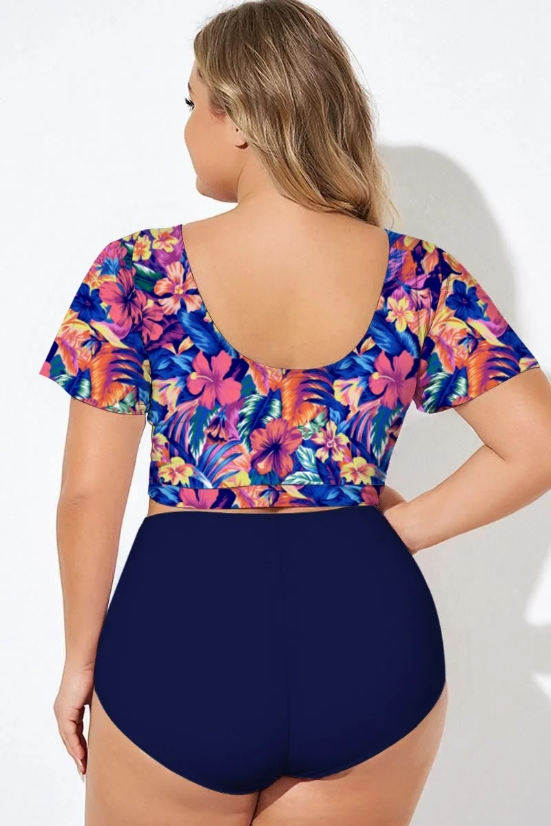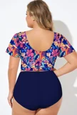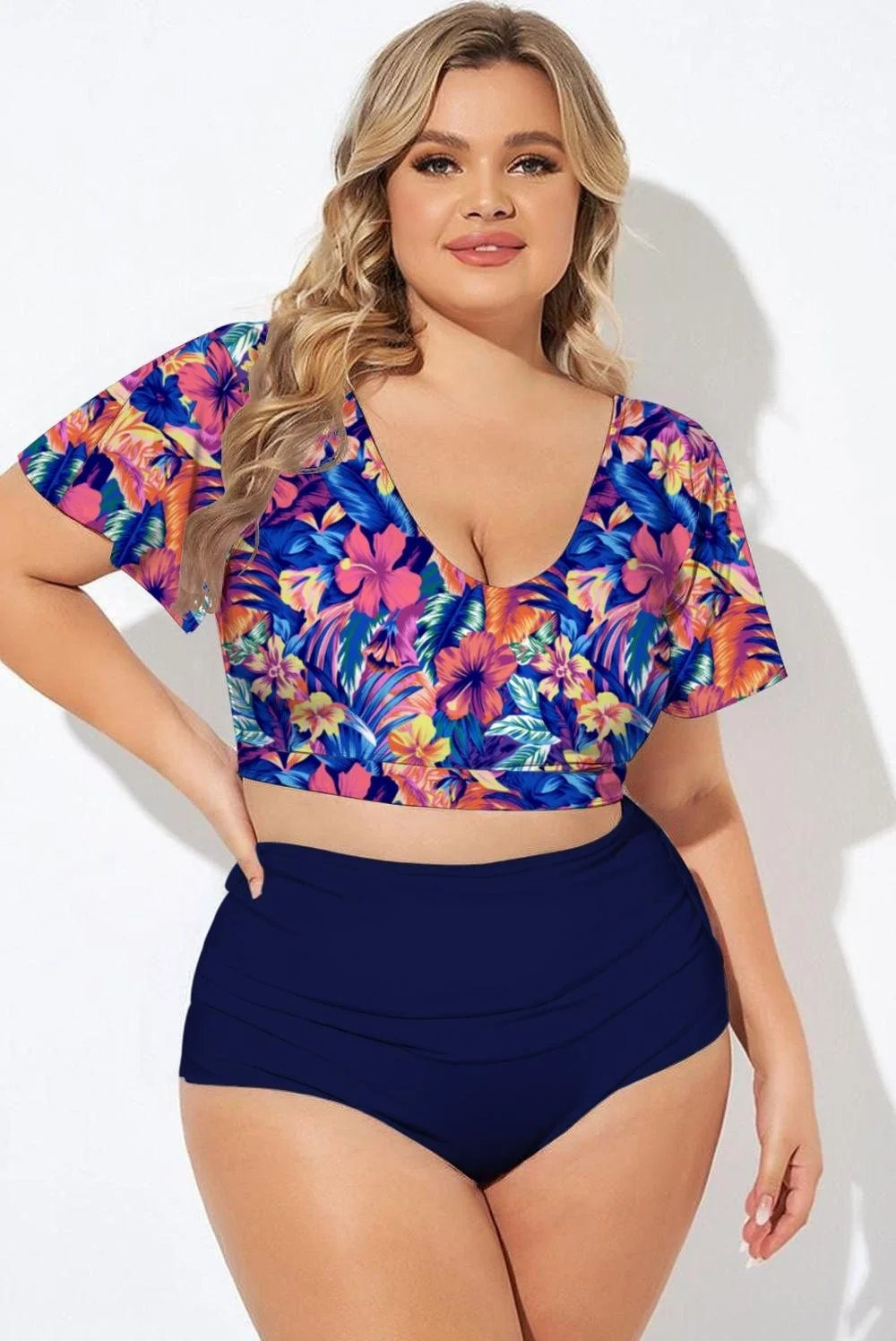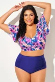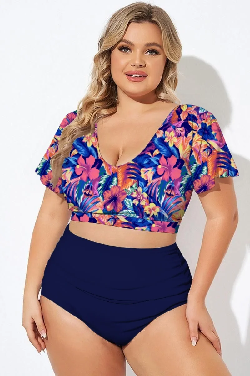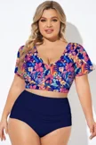 Colorful Floral Print V-neck Flutter Sleeve Bikini Top