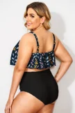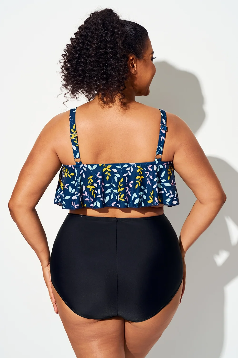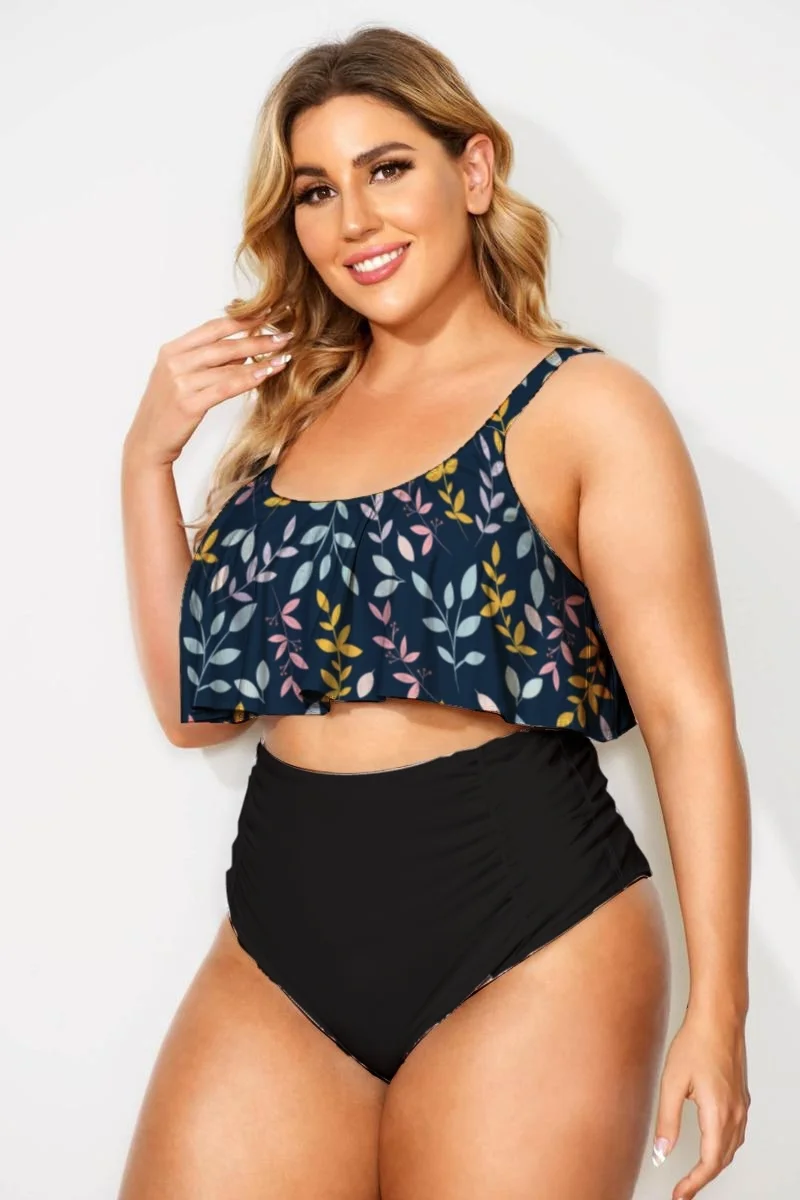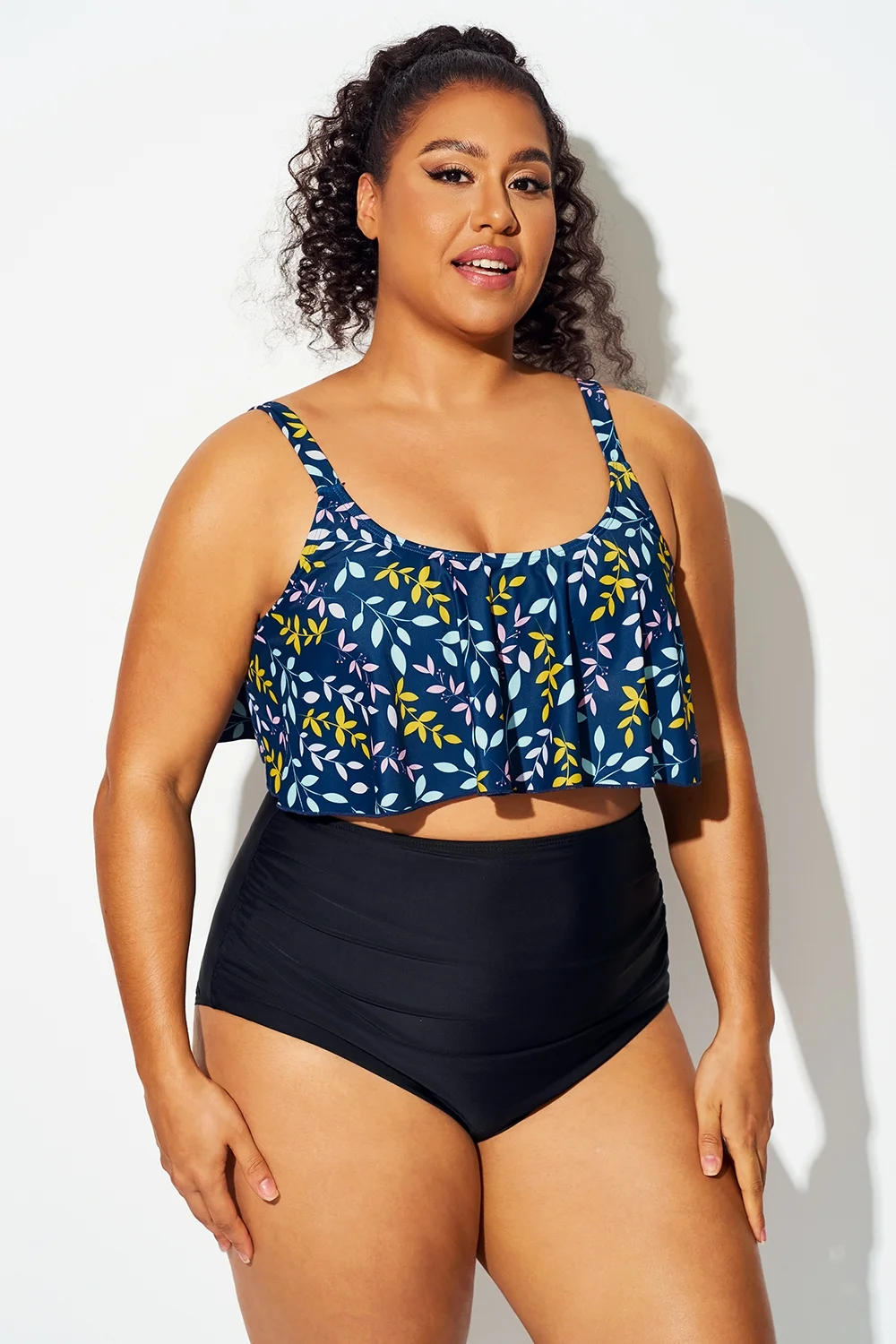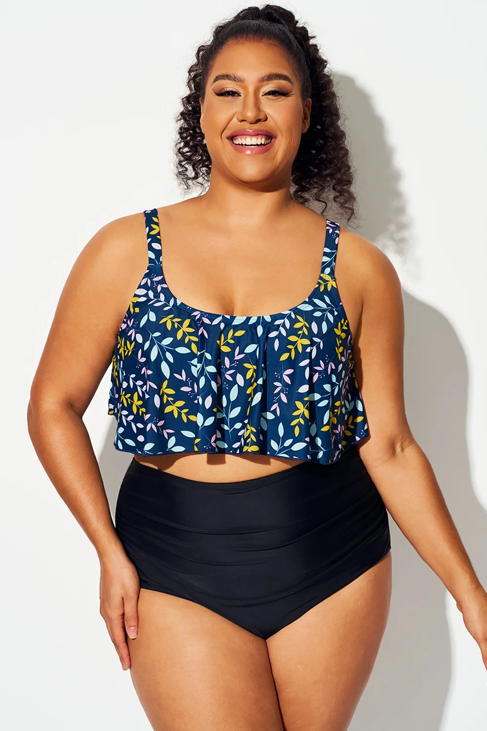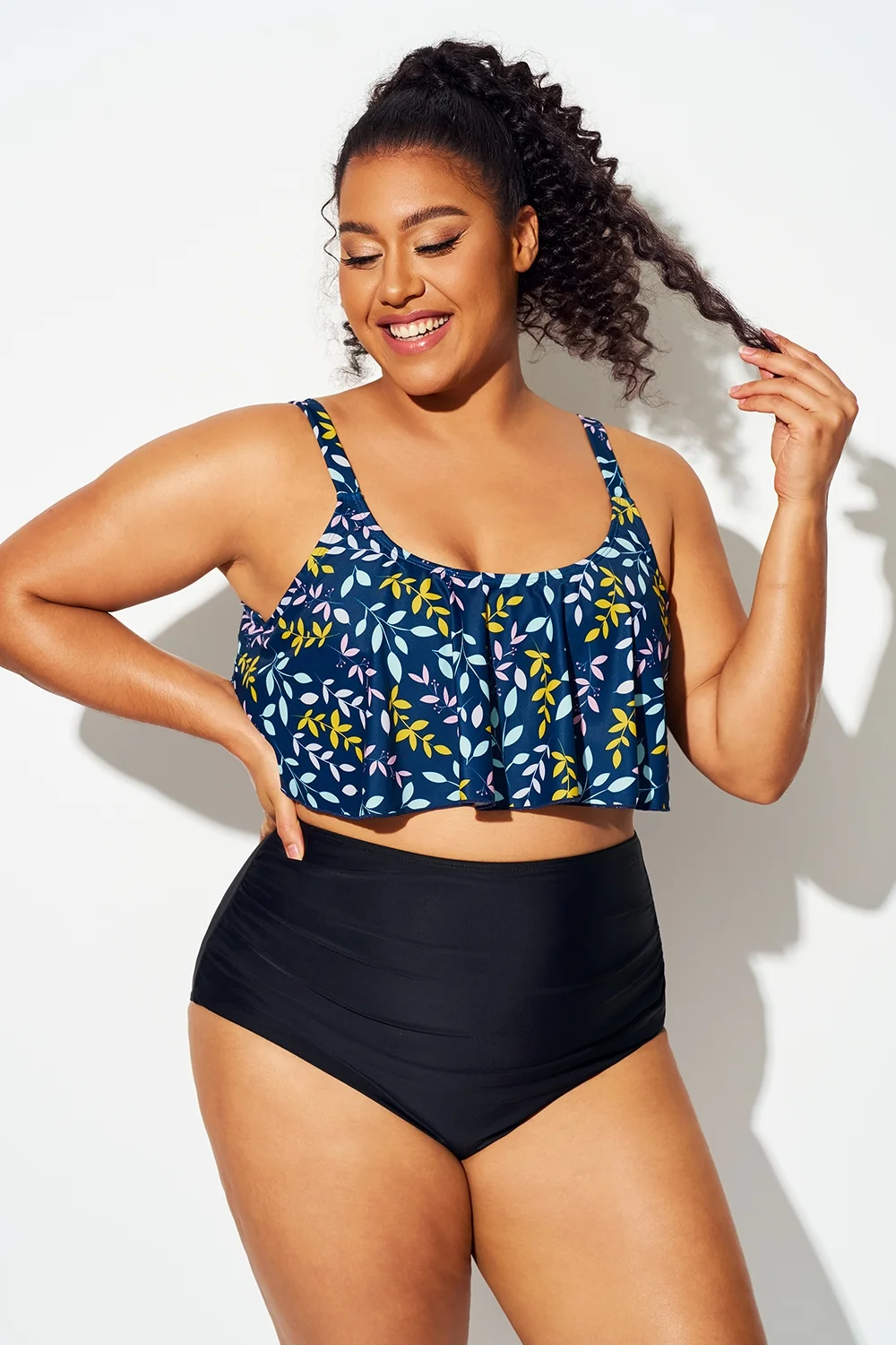 Colorful Leaf Print Crew Neck Ruffled Bikini Top