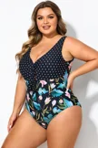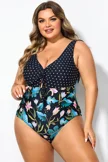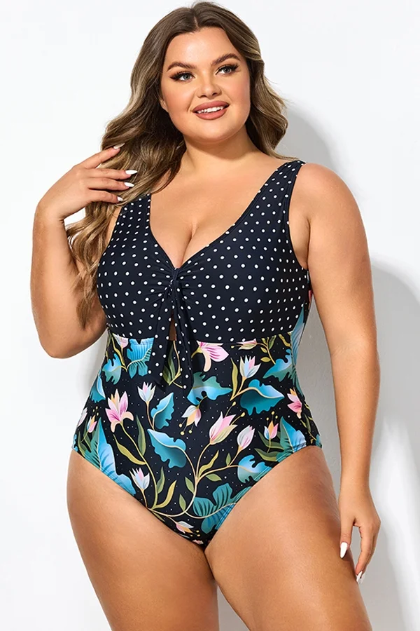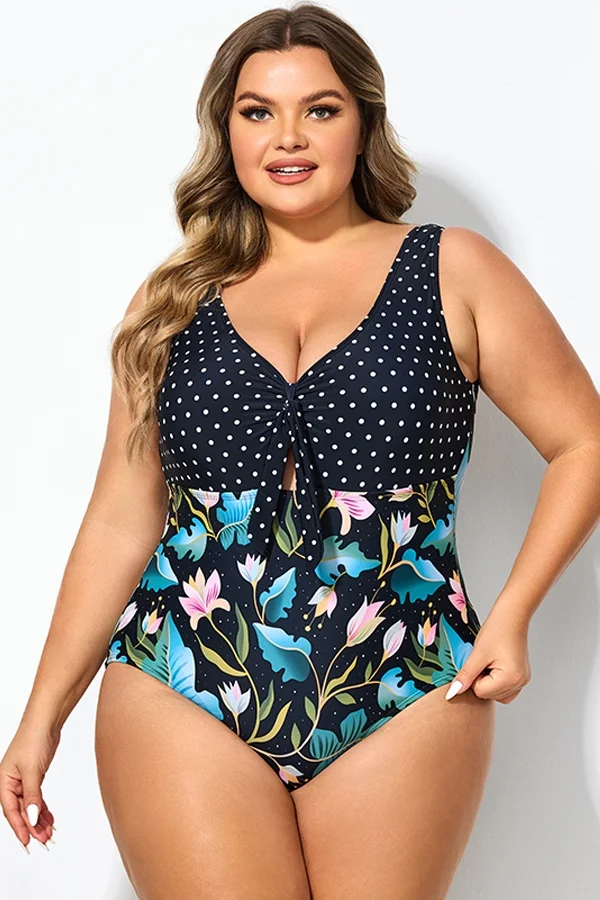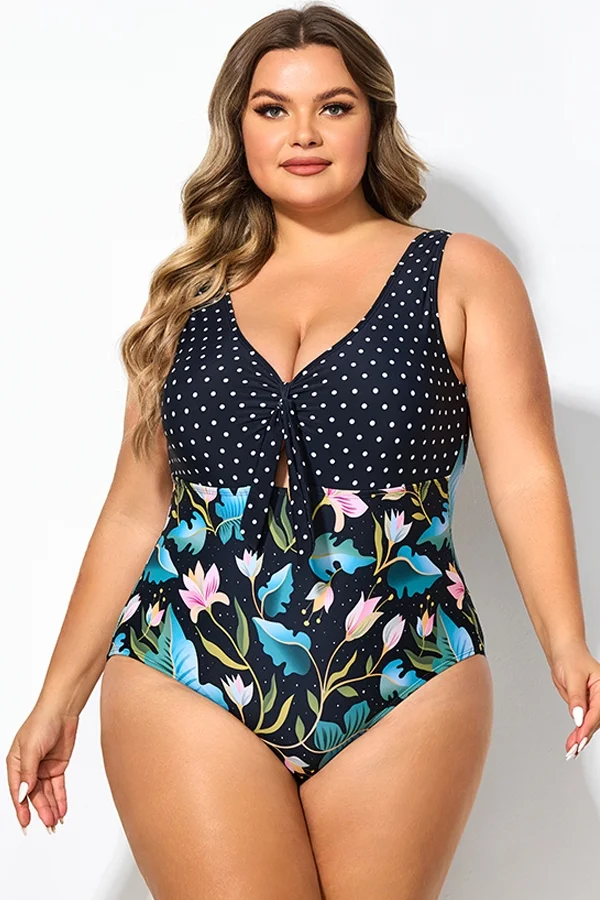 Crewneck Flower Print Polka Dots Knot One Piece Swimsuit - PremCurve