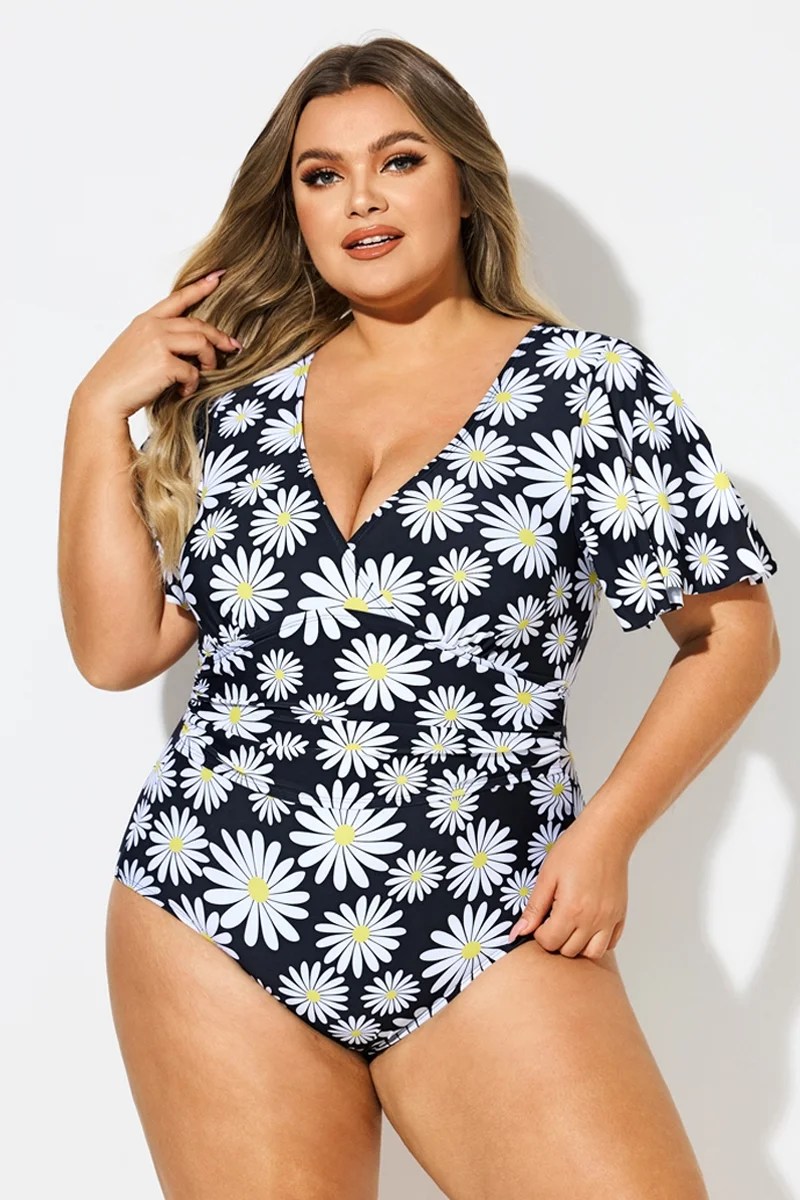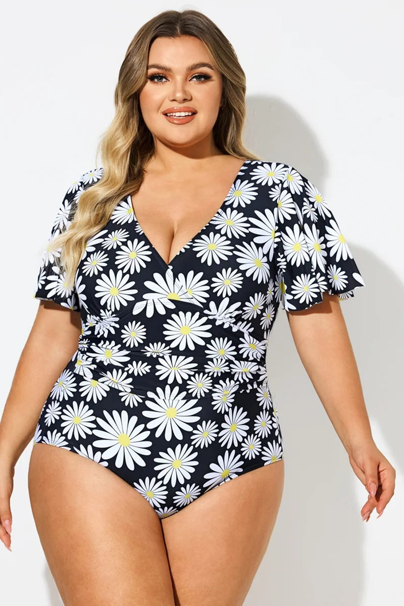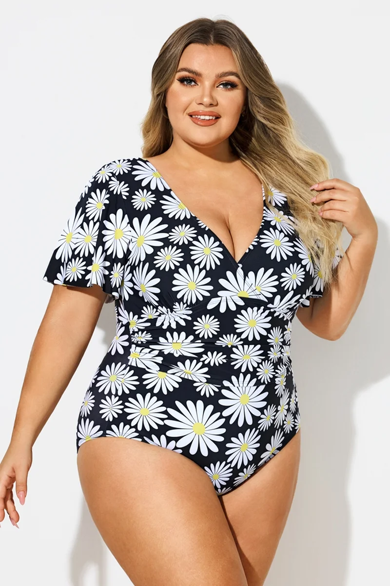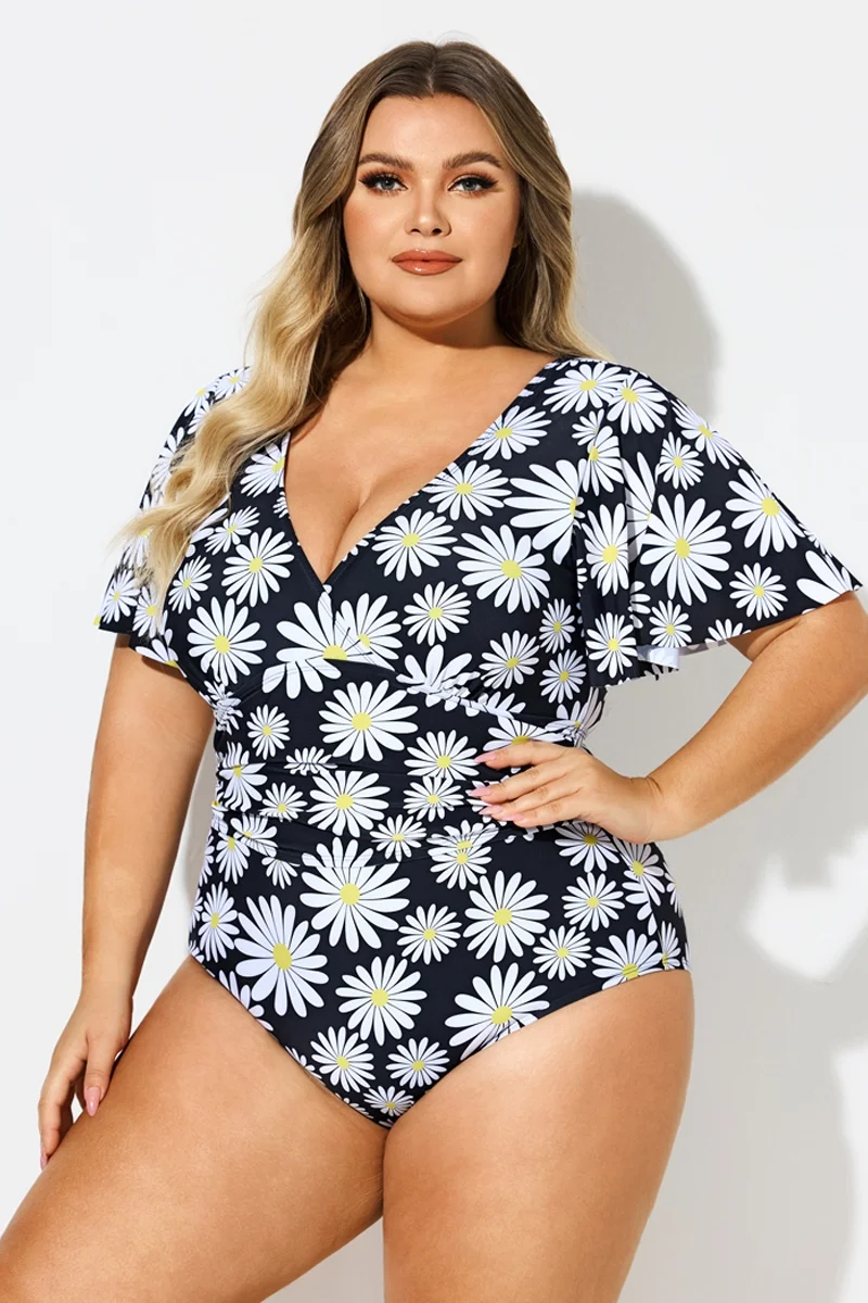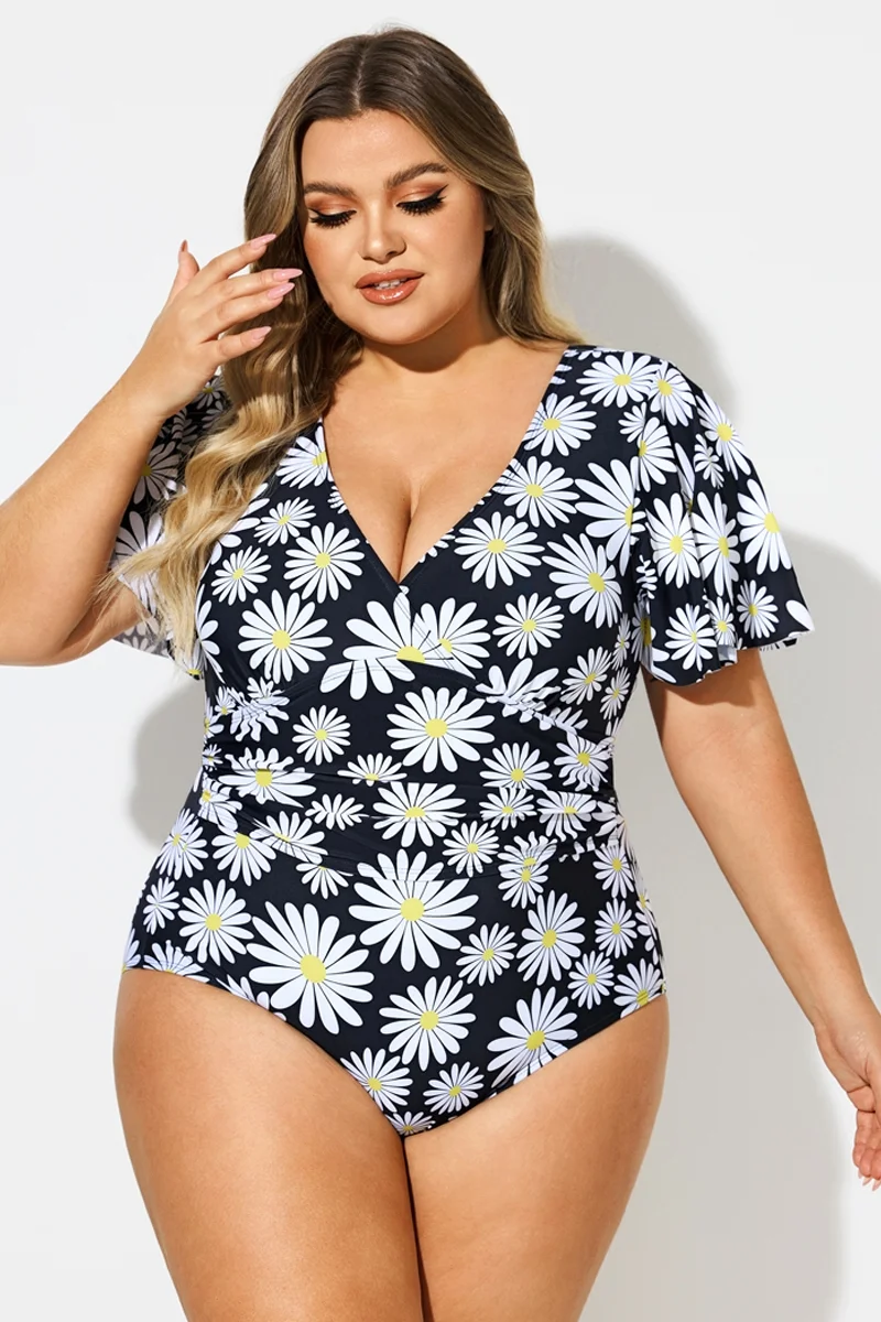 Daisy Print V-Neck Ruffle Sleeves One Piece Swimsuit - PremCurve