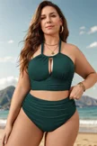 Plus Size Round Neck Black Patchwork Bikini Top