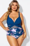 Plus Size Round Neck Black Patchwork Bikini Top
