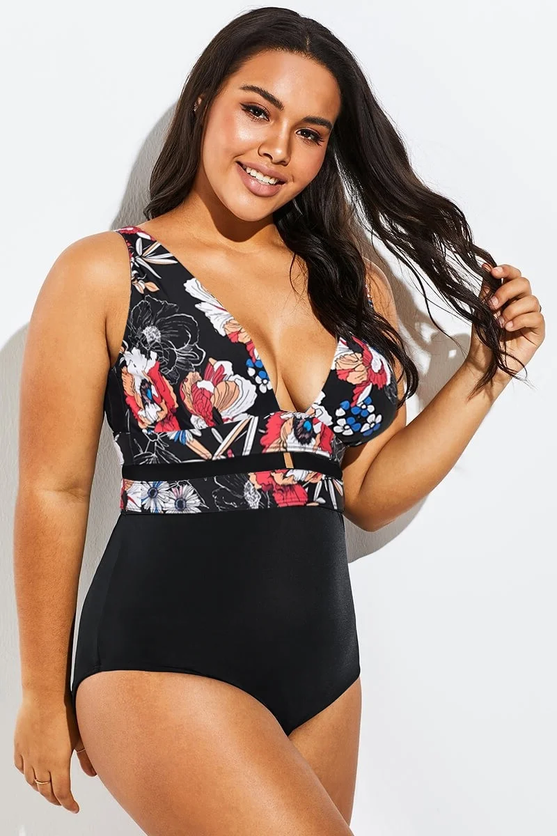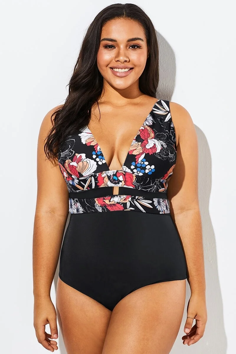 Floral Print Cut Out One Piece Swimsuit - PremCurve