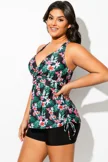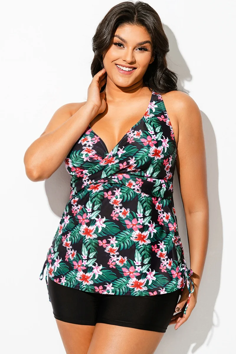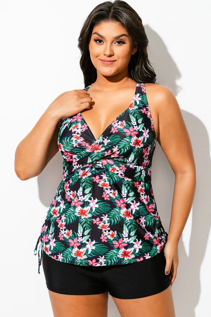 Floral Print Drawstring Side Adjustable Strap Tankini Top - PremCurve
