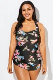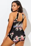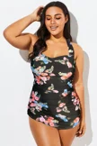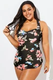 Black Floral Printed Double Strap Women Swimdress