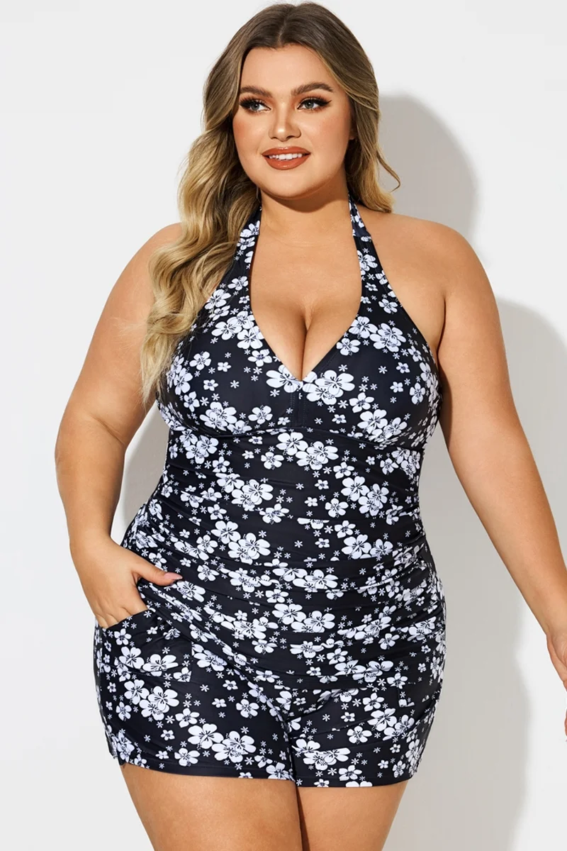 Black & White Floral Print Ruffle V-Neck One Piece Swimsuit