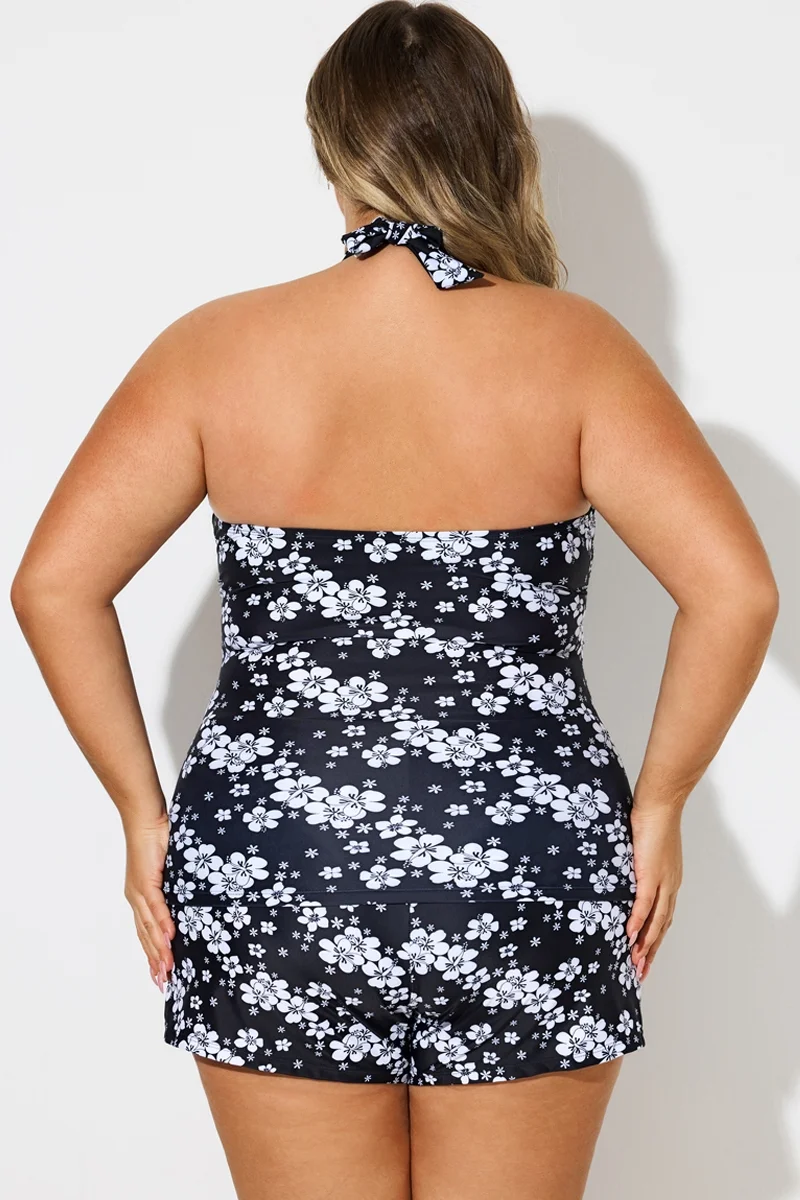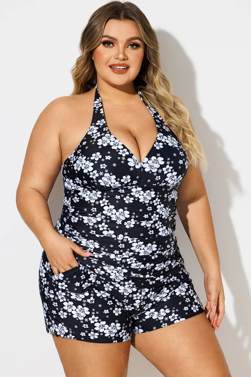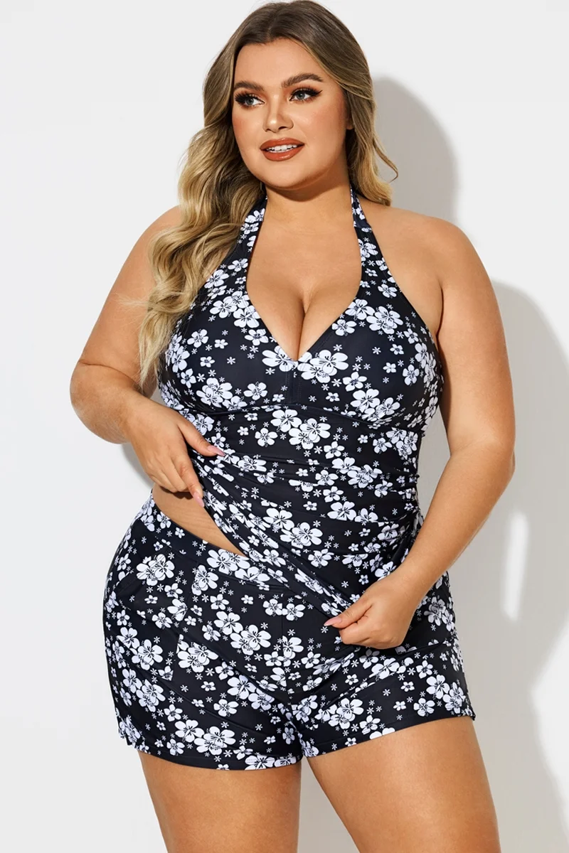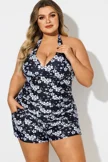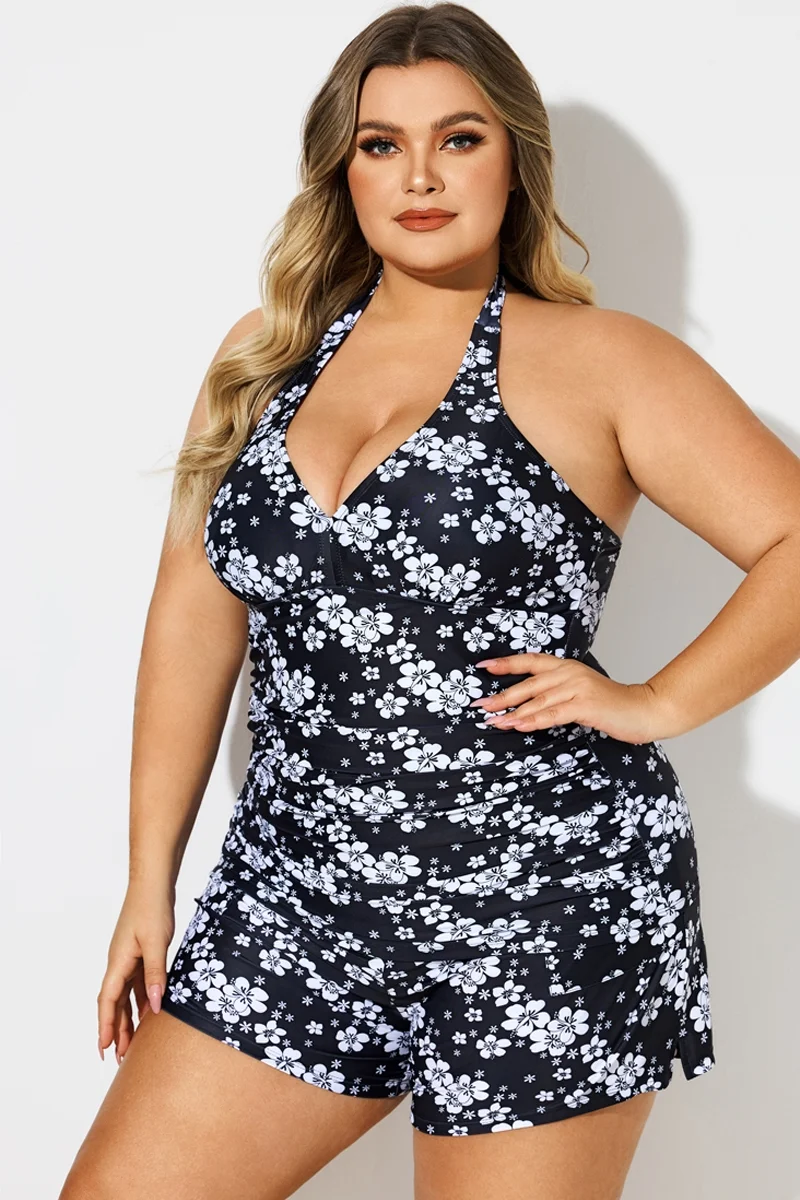 Floral Print Self-Tie Halter Shirred Tankini Top - PremCurve