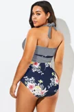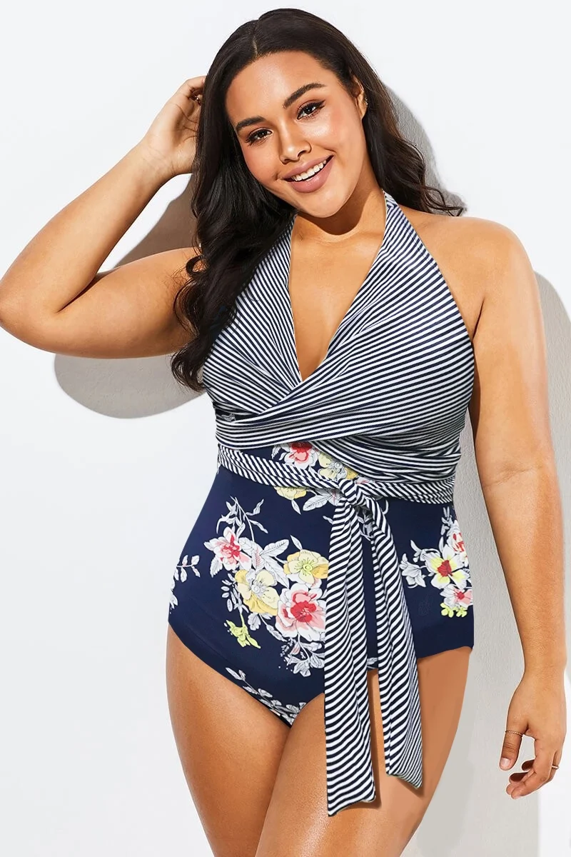 Floral Print Wrap Halter One Piece Swimsuit