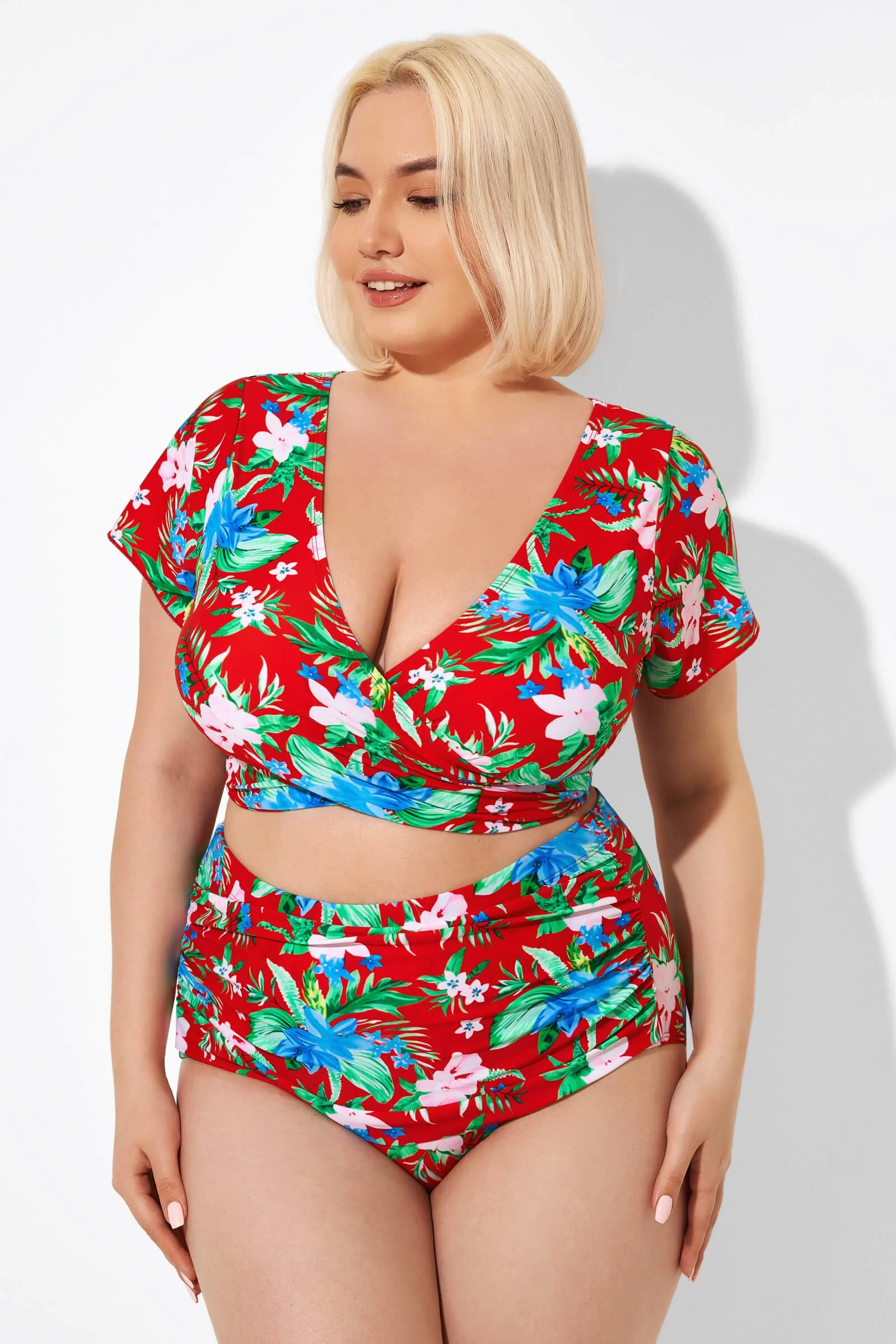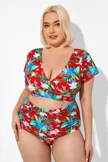 Flower Printed V-neck Bikini Top with Sleeves