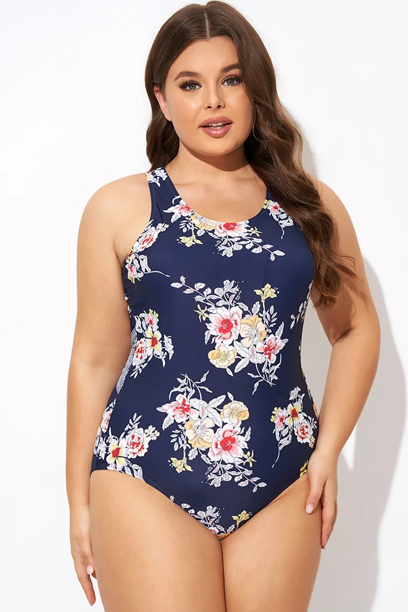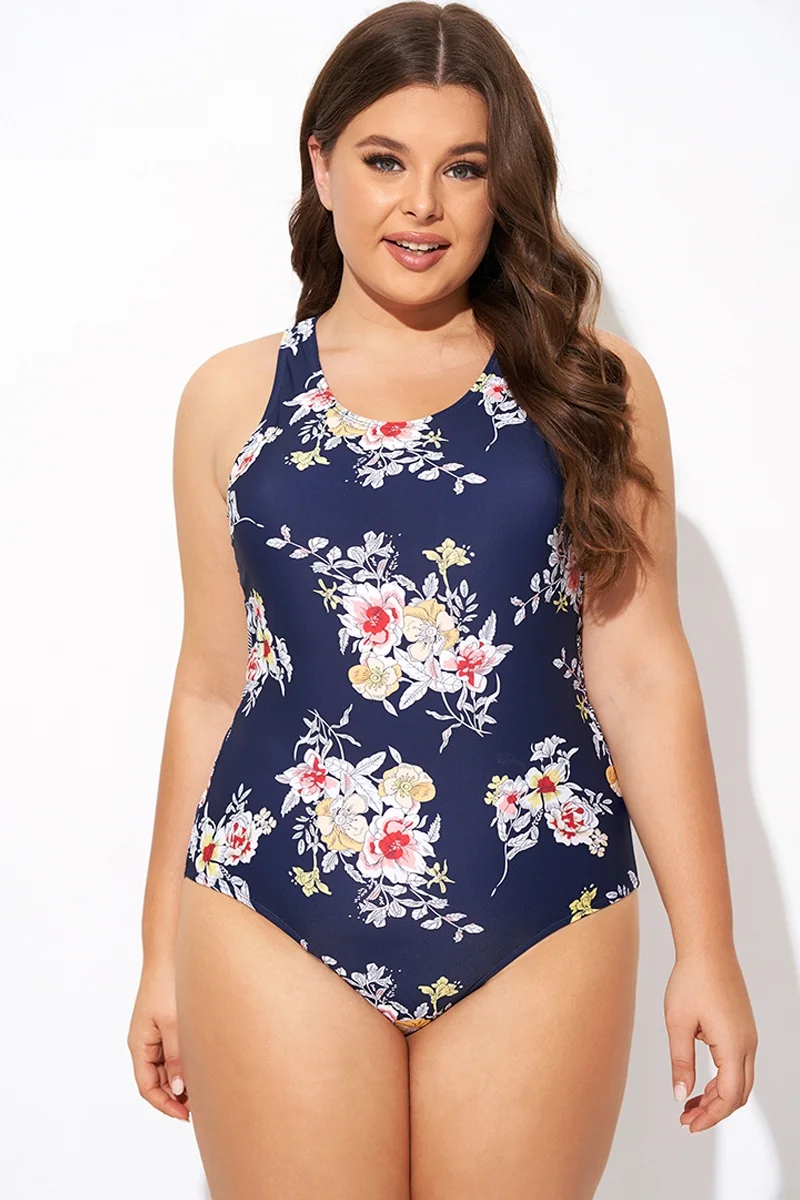 Flower Stripes Scoop Neck Cross Back One Piece Swimsuit - PremCurve