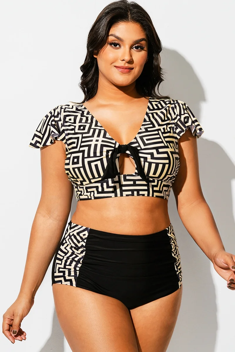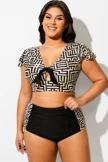 Geometric Print Retro Women Bikini Top With Sleeves - PremCurve