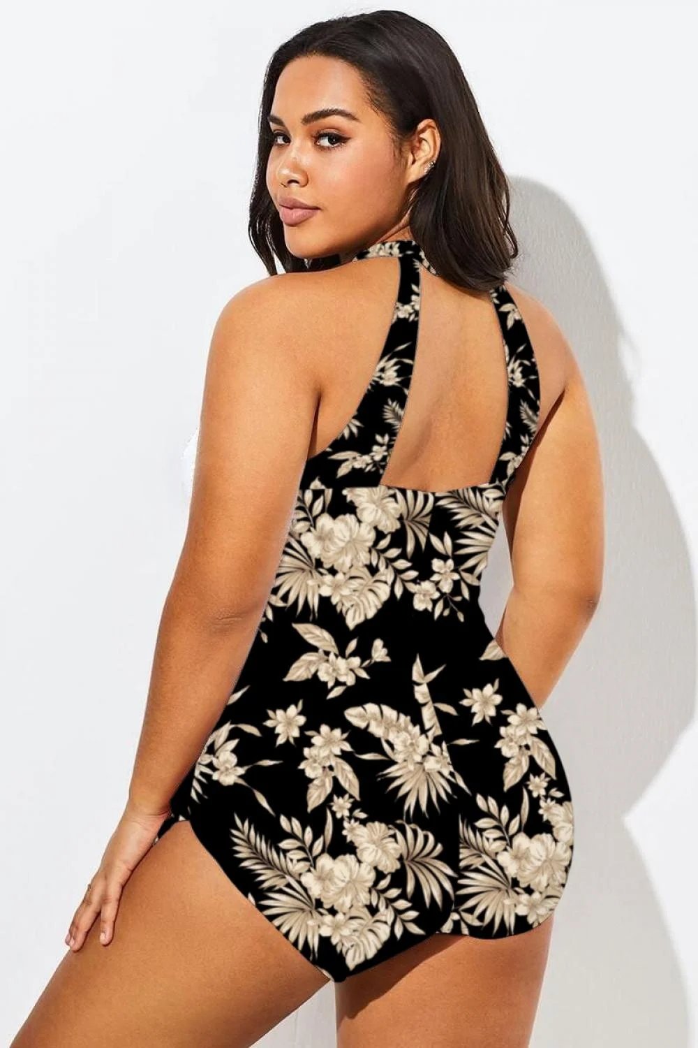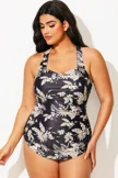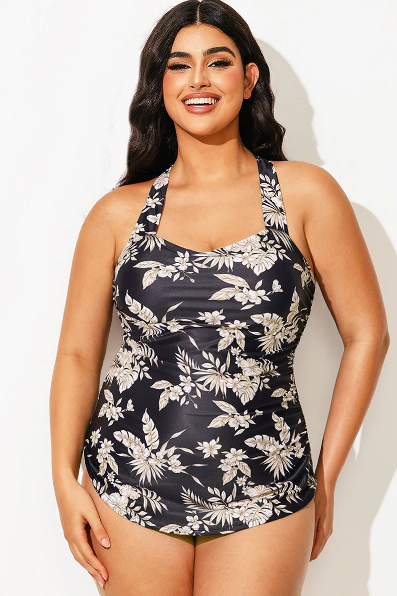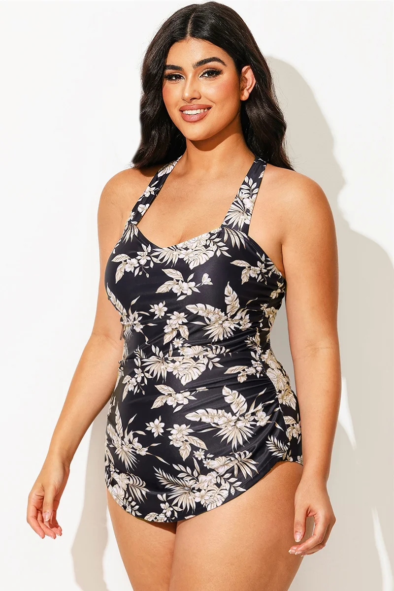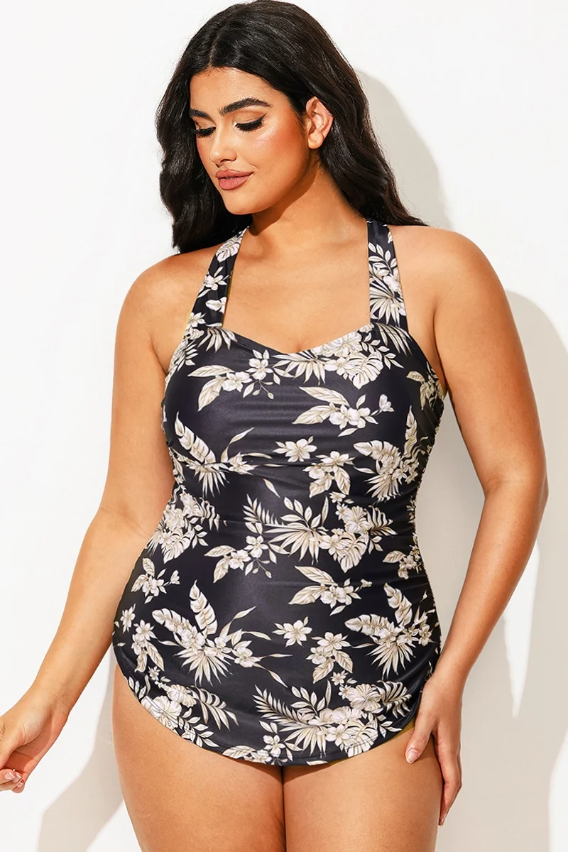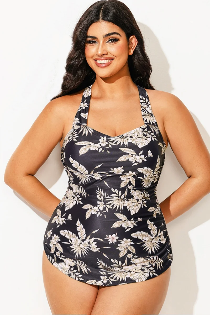 V-Neck Halter Floral Print One Piece Swimsuit
