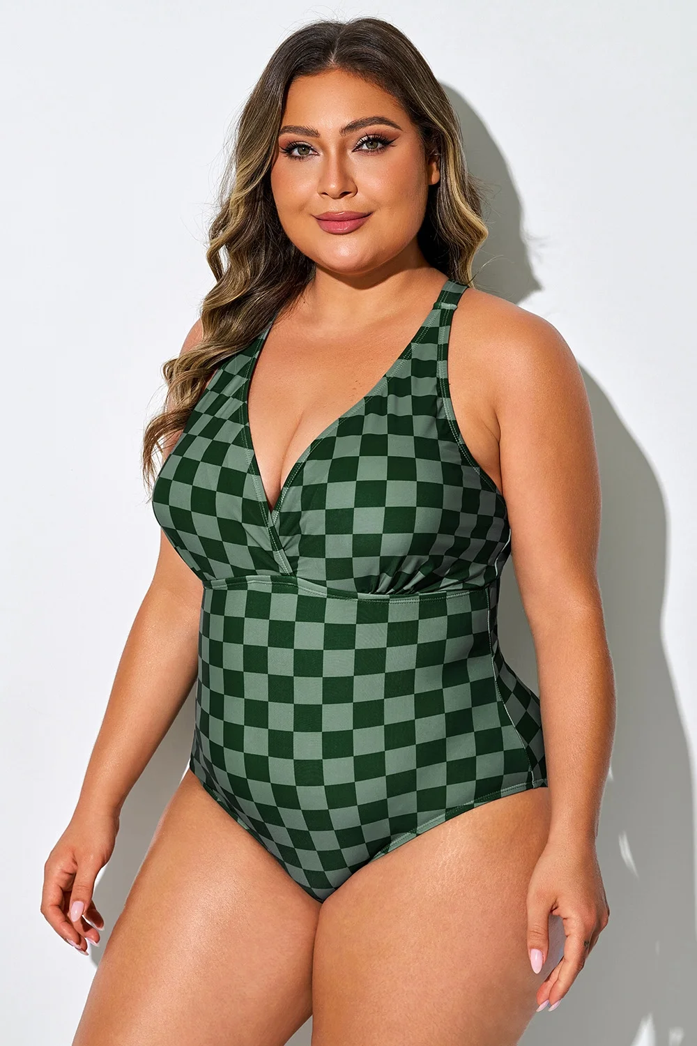 Green Check Cross Back Straps One Piece Swimsuit - PremCurve