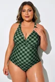 Green Check Cross Back Straps One Piece Swimsuit