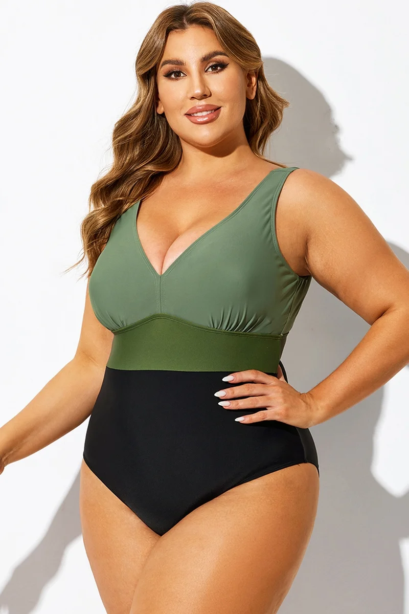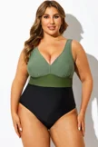 Green Colorblock V-Neck One Piece Swimsuit - PremCurve