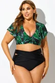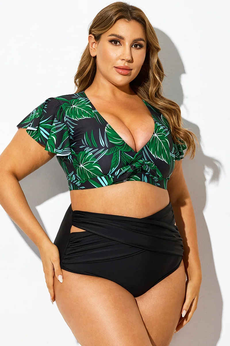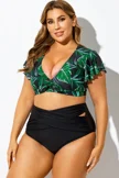 Green Plant Print Flutter-Sleeve Swim Bikini Top
