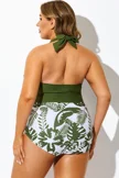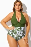 Green Tropical Print Spliced Halter One Piece Swimsuit