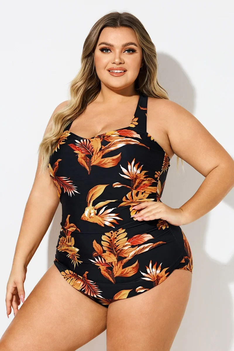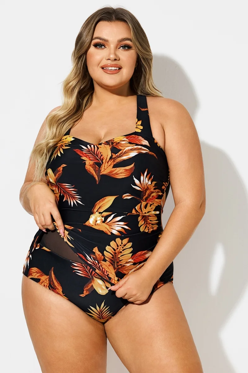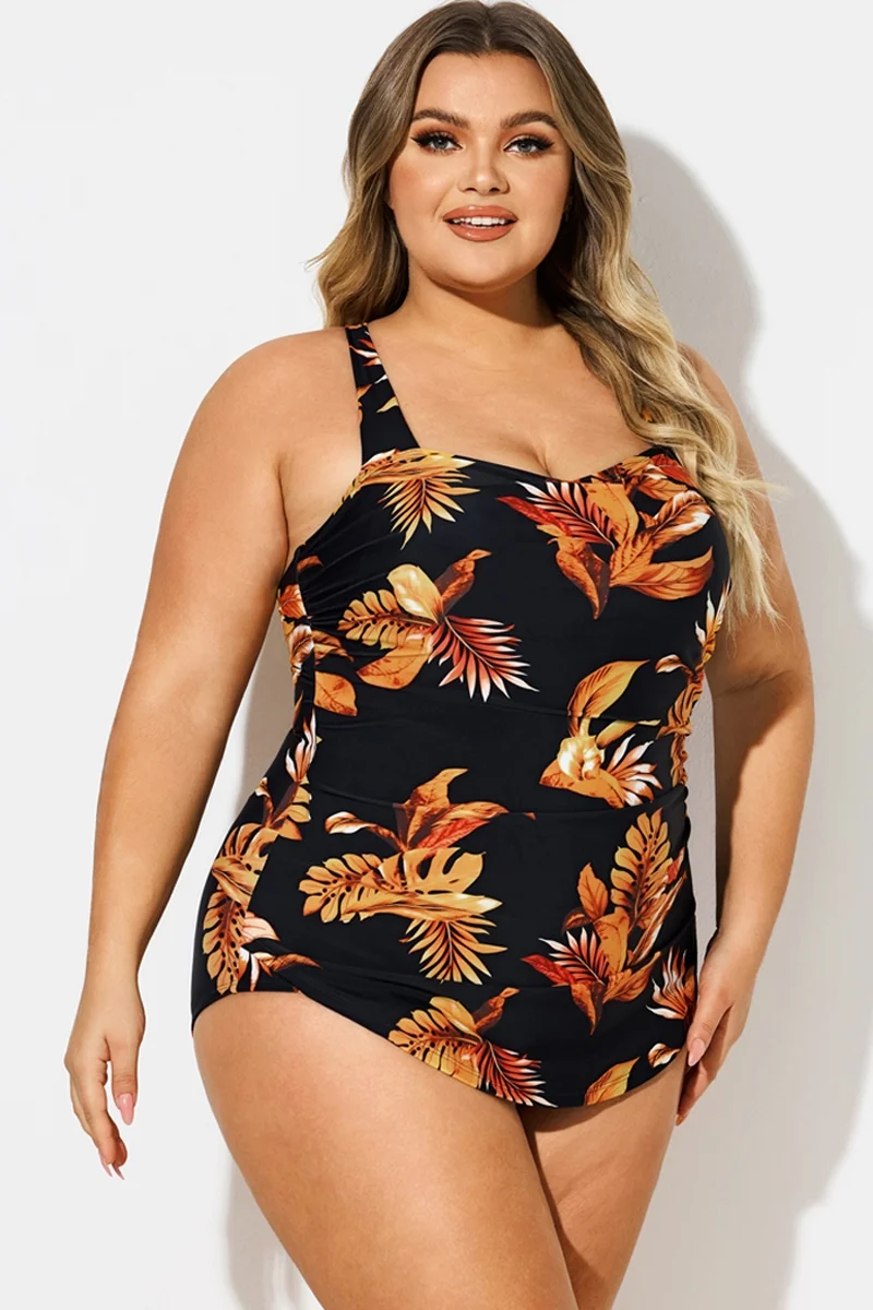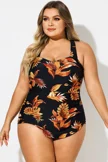 Leaf Print H-Back Sarong Front One Piece Swimsuit - PremCurve