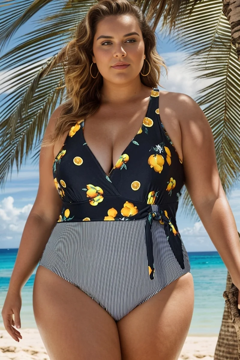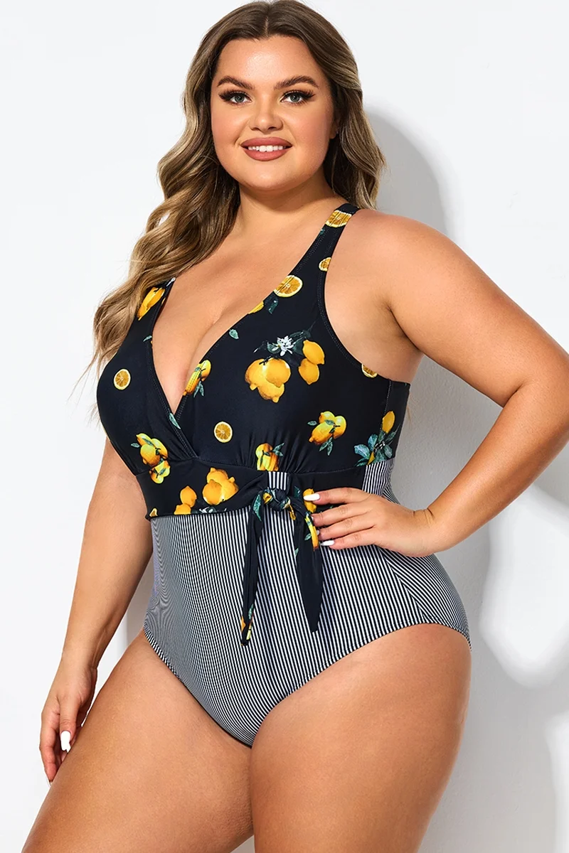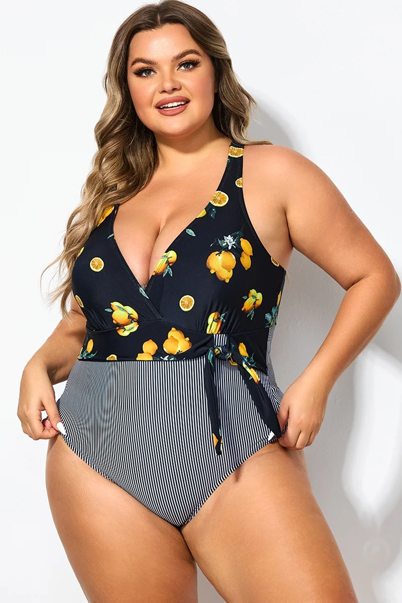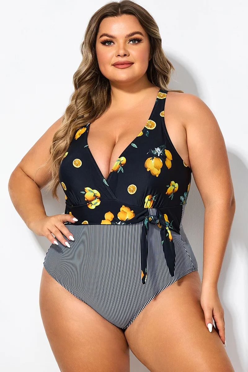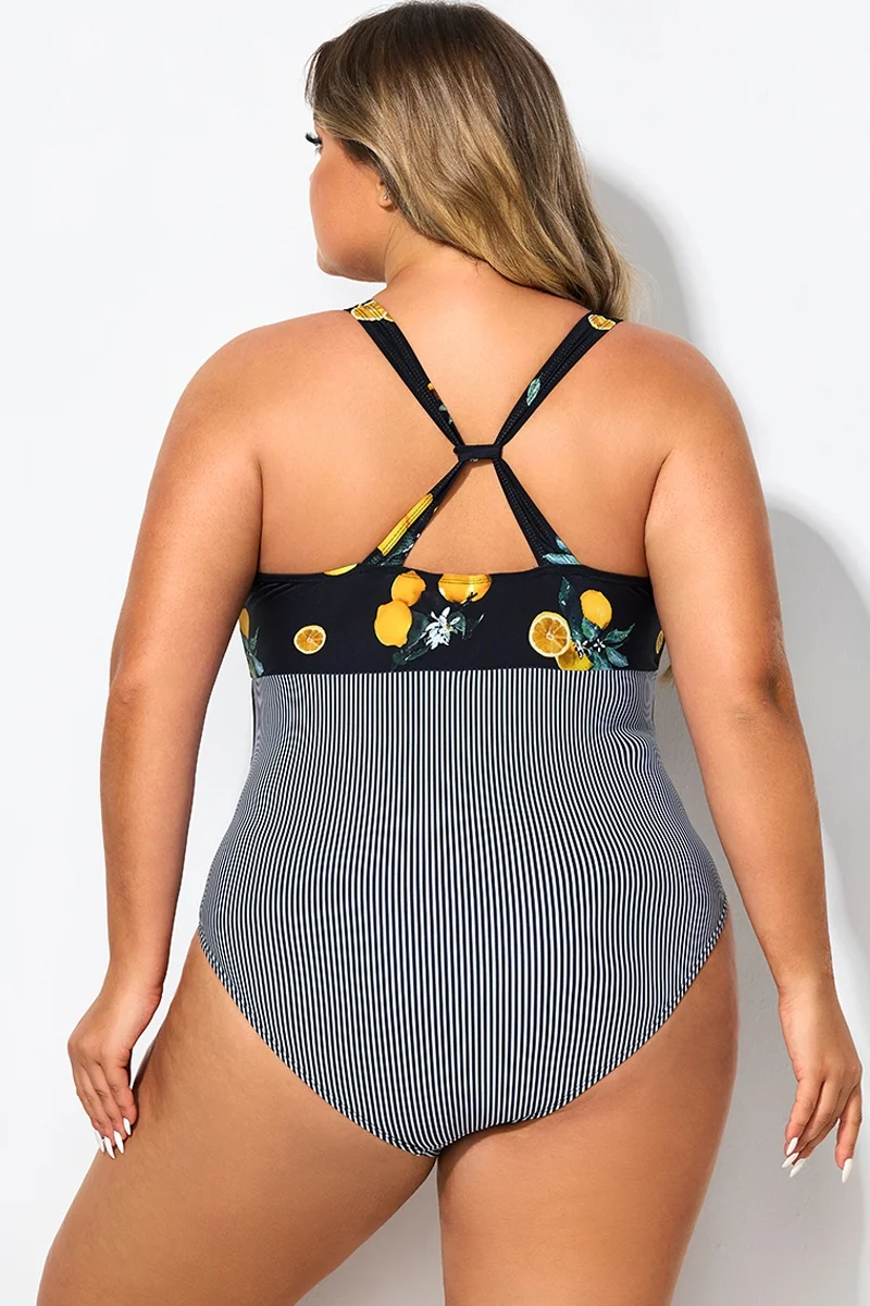 Lemon Stripes Print Front Lining One Piece Swimsuit - PremCurve
