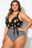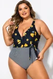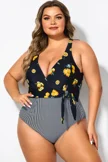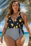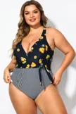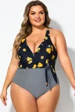 Lemon Stripes Print Front Lining One Piece Swimsuit