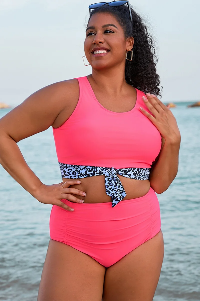 Leopard Print Stitching Knotted Crop Bikini Top