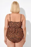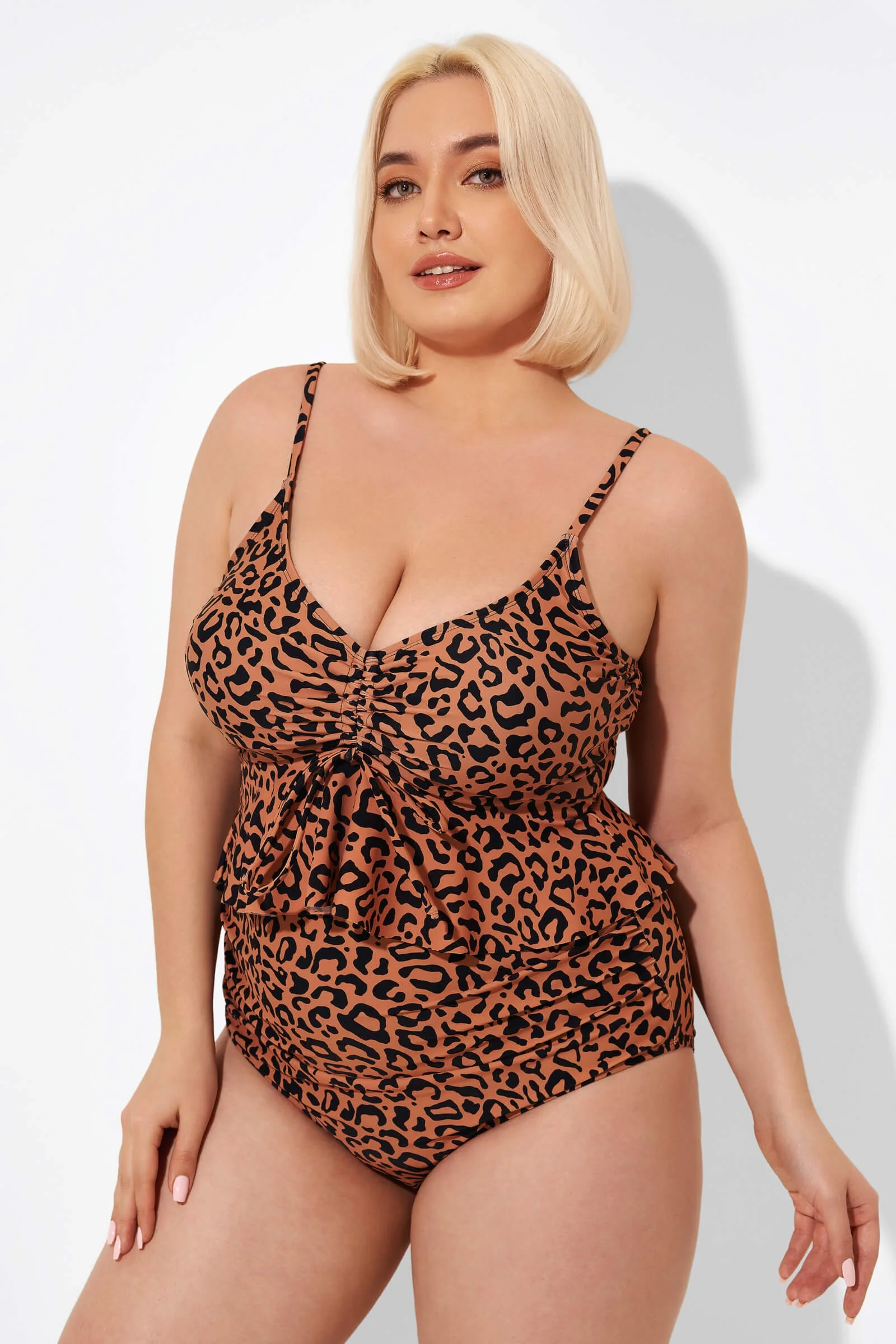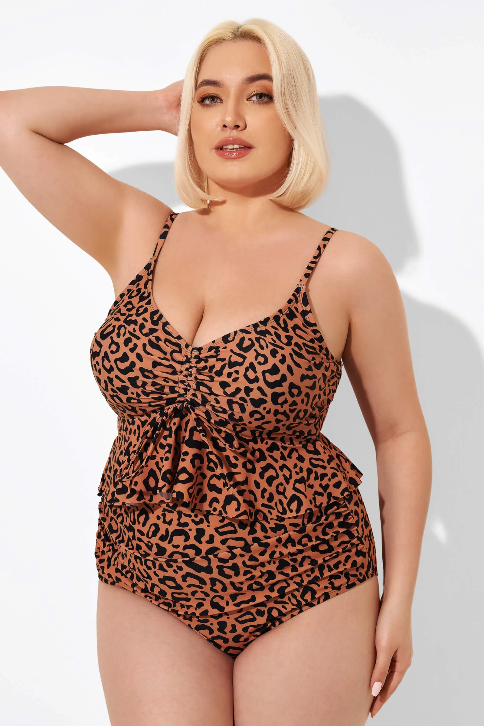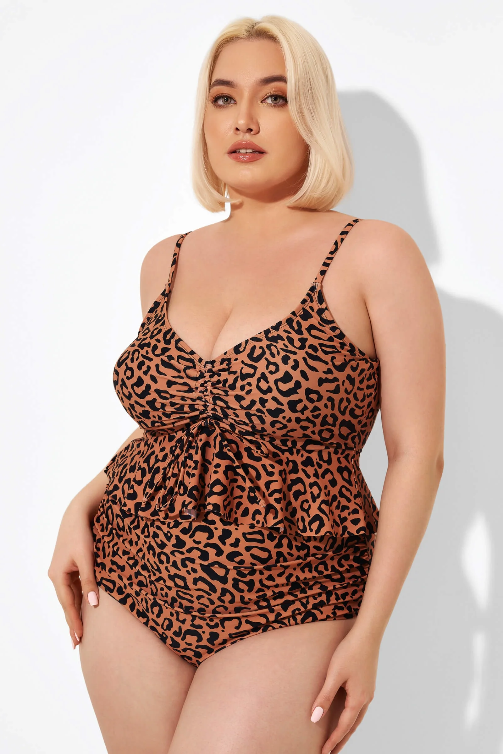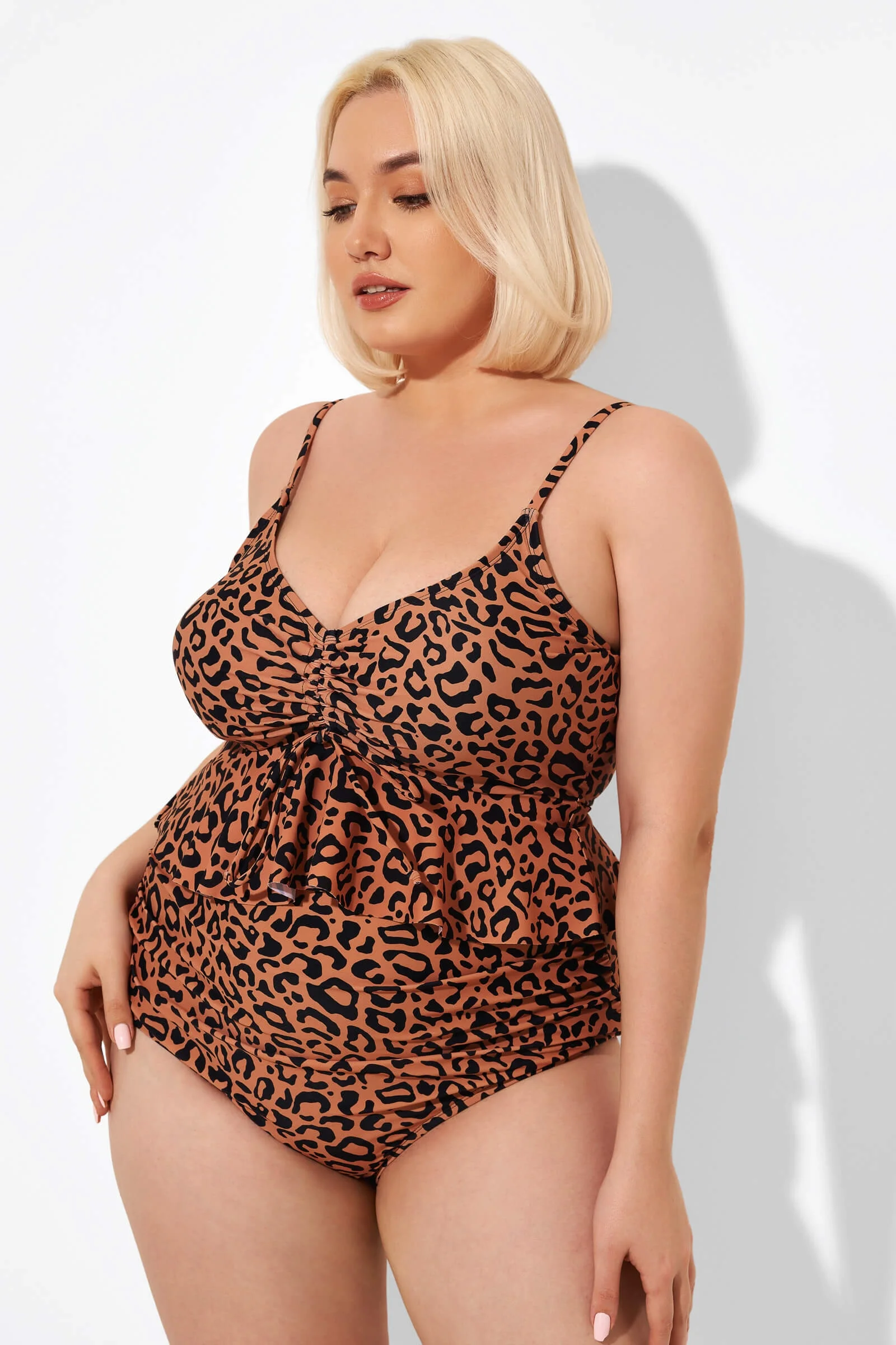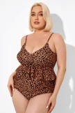 Leopard Scoopneck Tie Front Ruched Hem Tankini Top - PremCurve