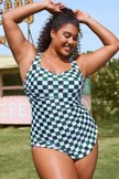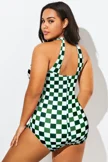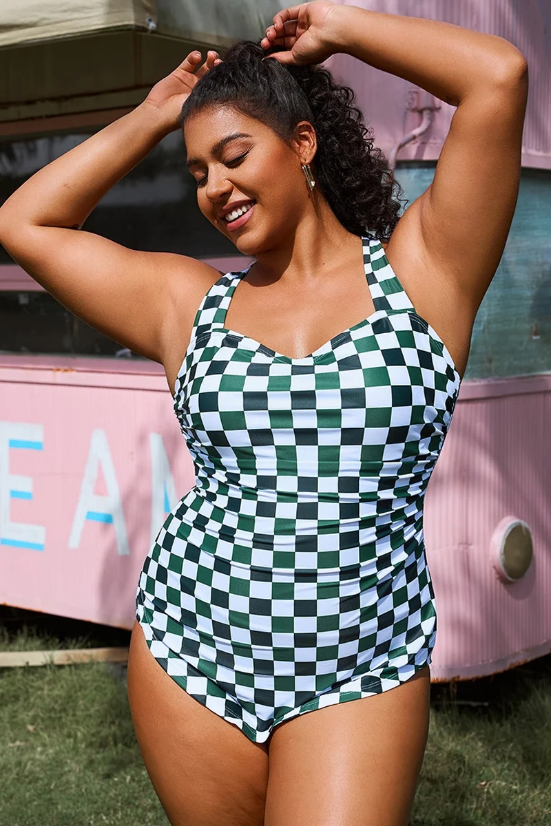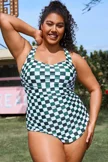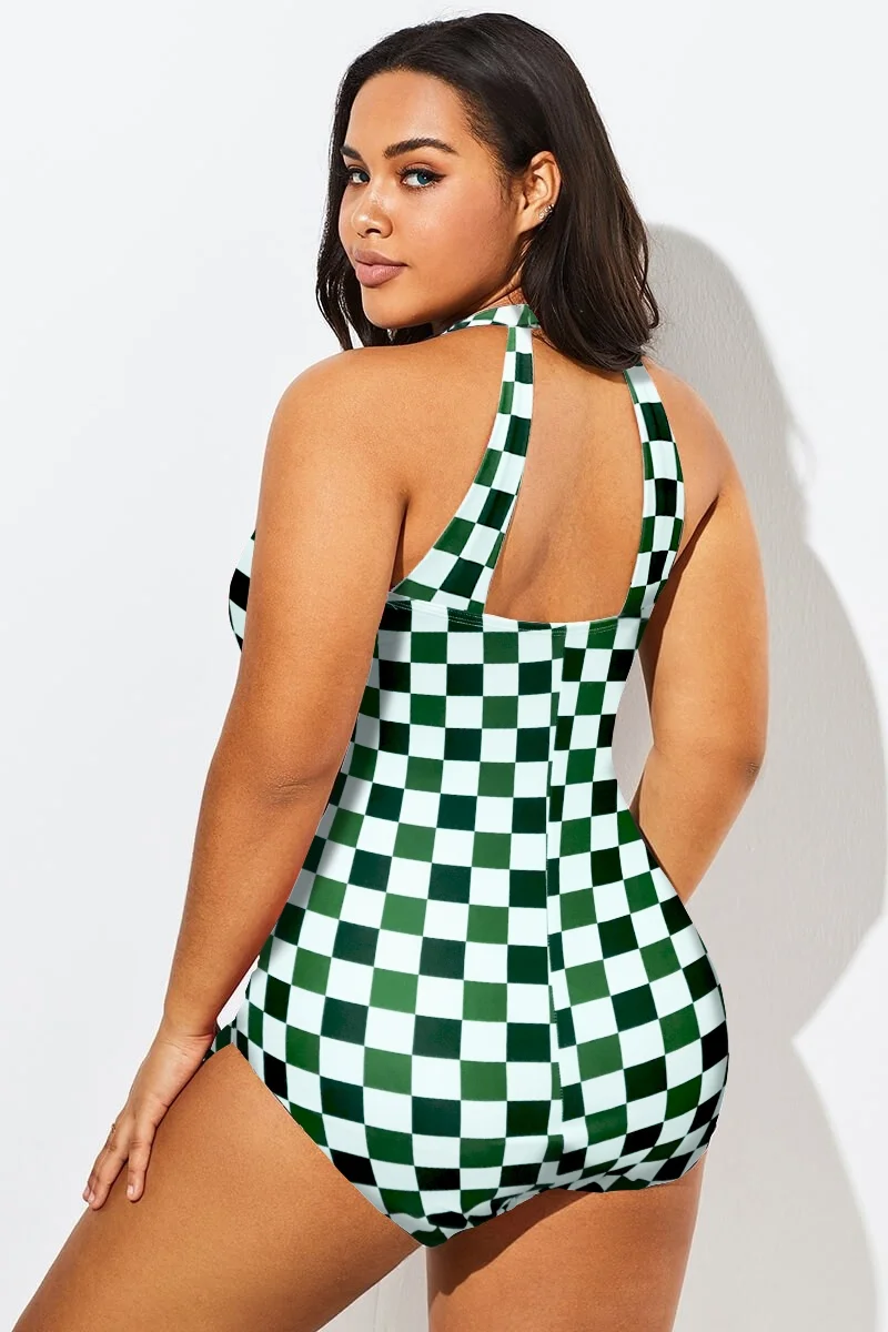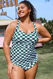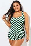 Light Green Check Sarong Front One Piece Swimsuit - PremCurve