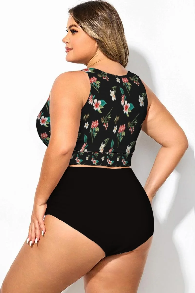 Plus Size Round Neck Black Patchwork Bikini Top