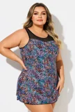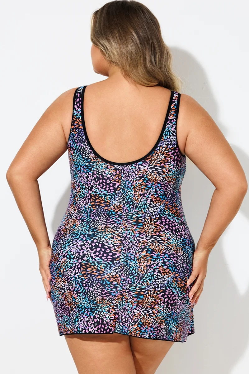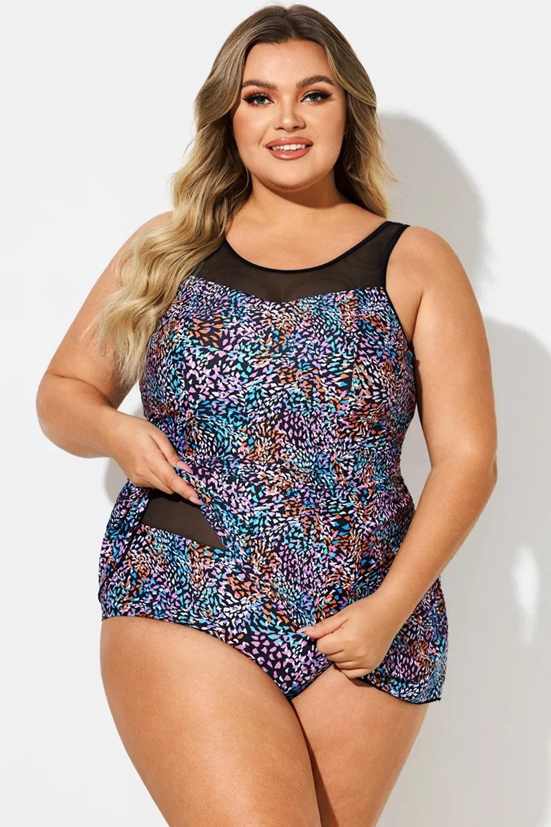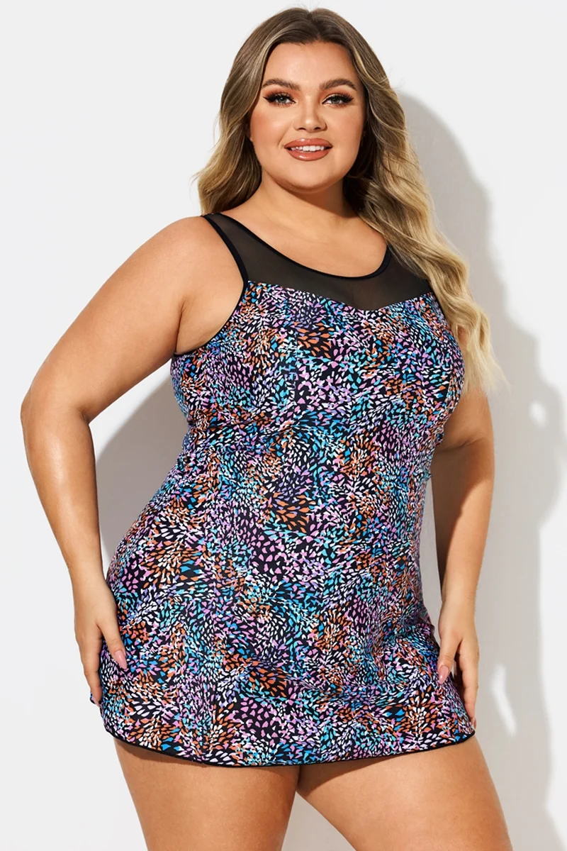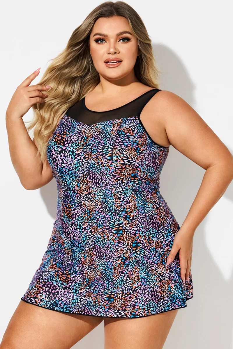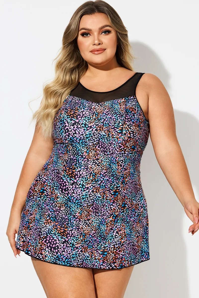 Multi Abstract Print Mesh High Neck Swimdress  - PremCurve