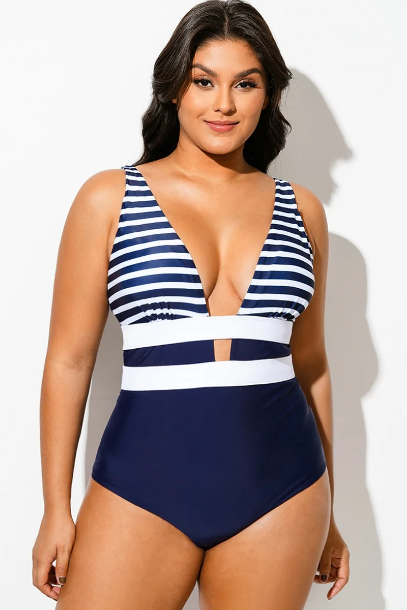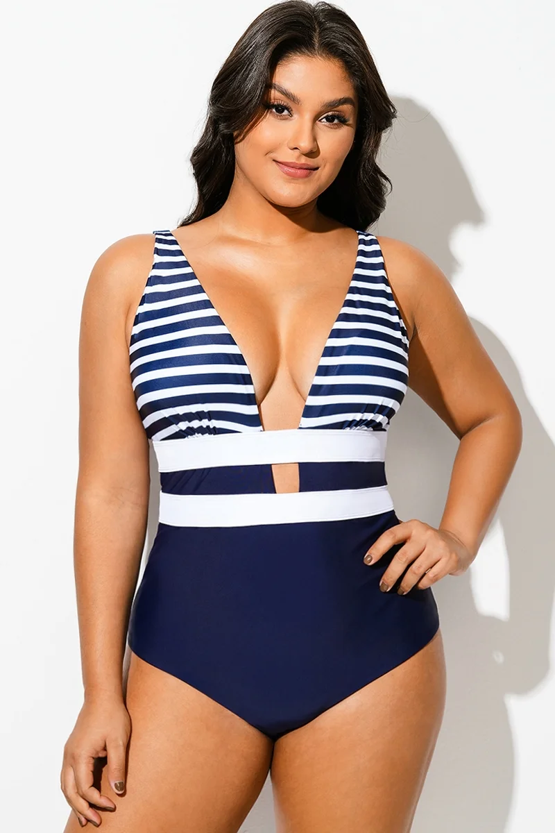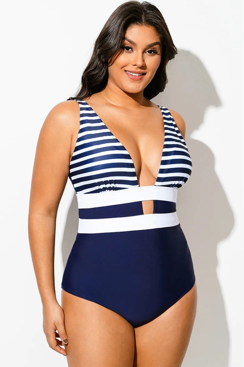 Navy Striped Cut Out One Piece Swimsuit - PremCurve