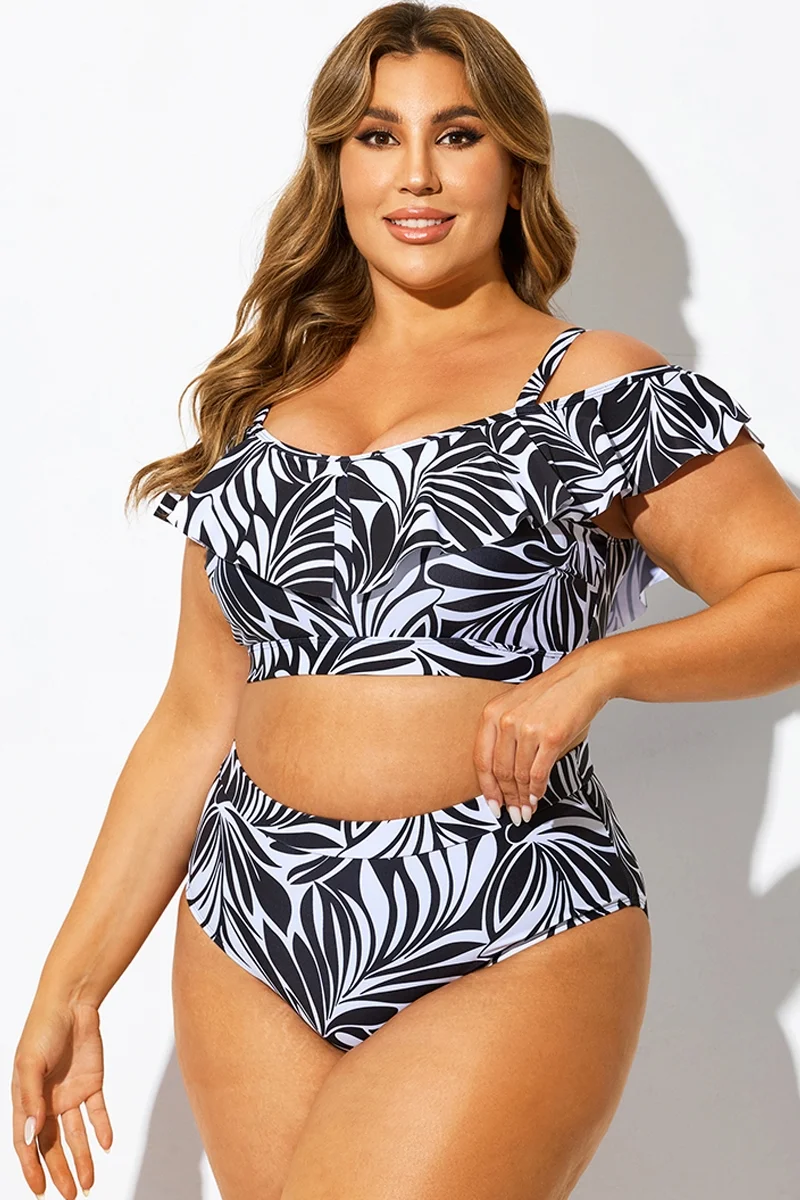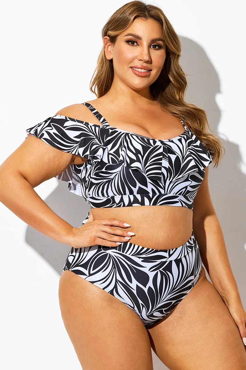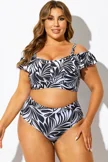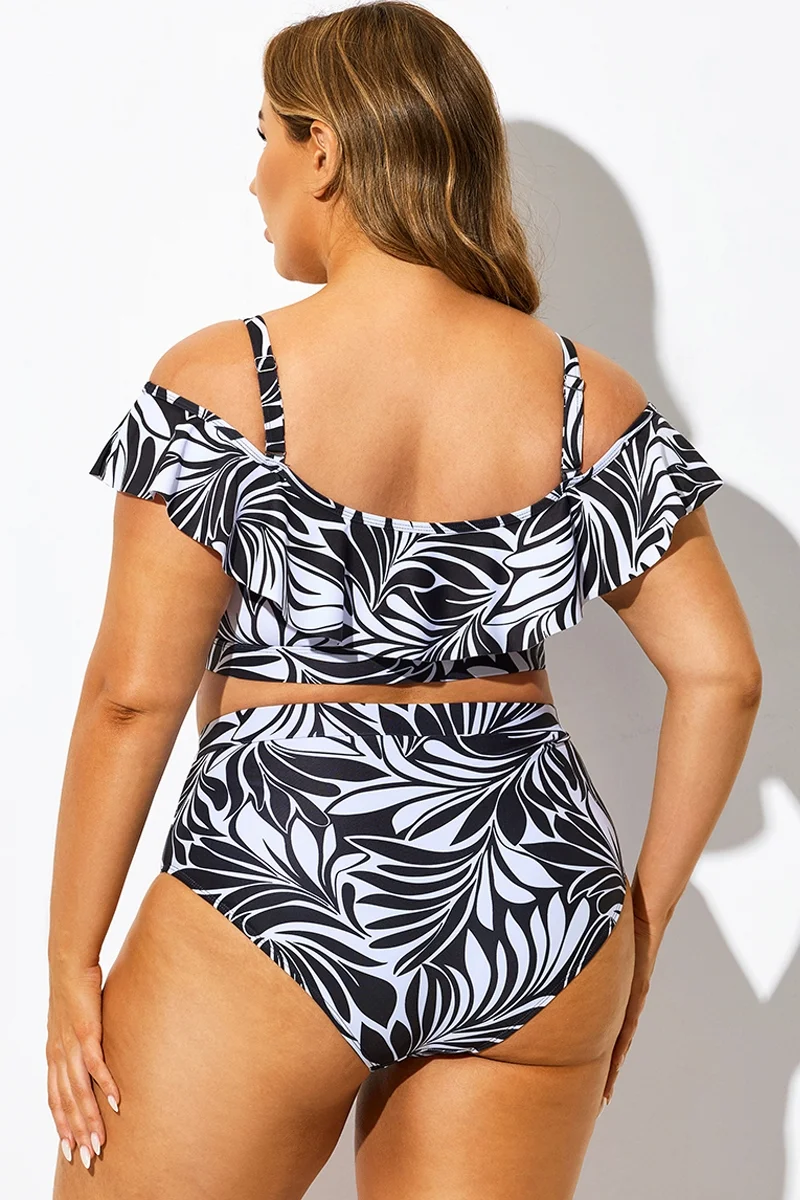Off Shoulder Black & White Floral Ruffle Bikini Top