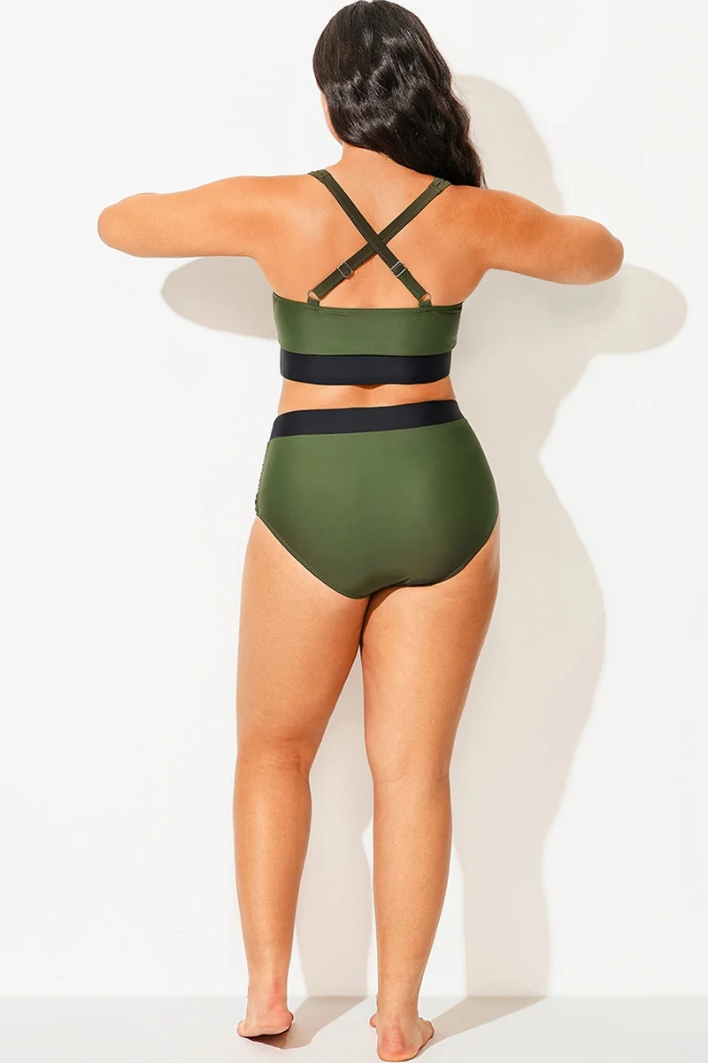 Plus Size Round Neck Black Patchwork Bikini Top