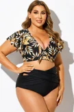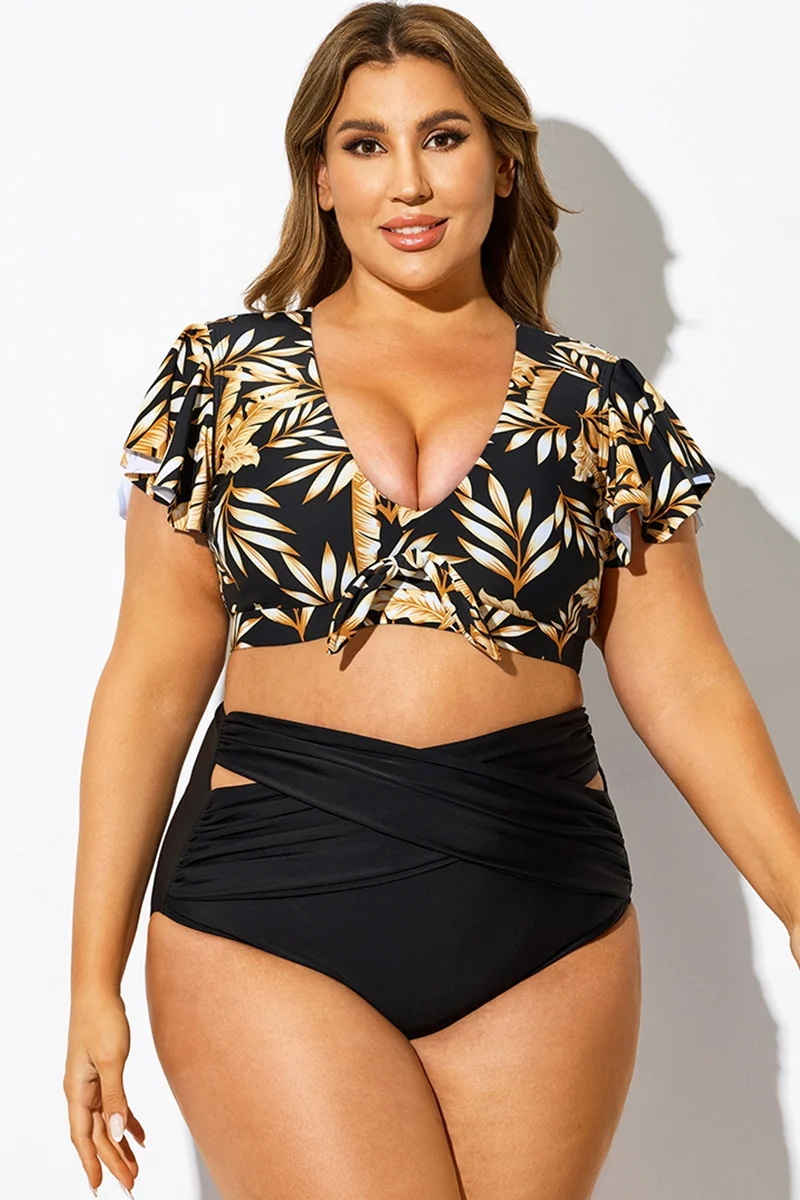 Plant Print Flutter-Sleeve Swim Bikini Top - PremCurve