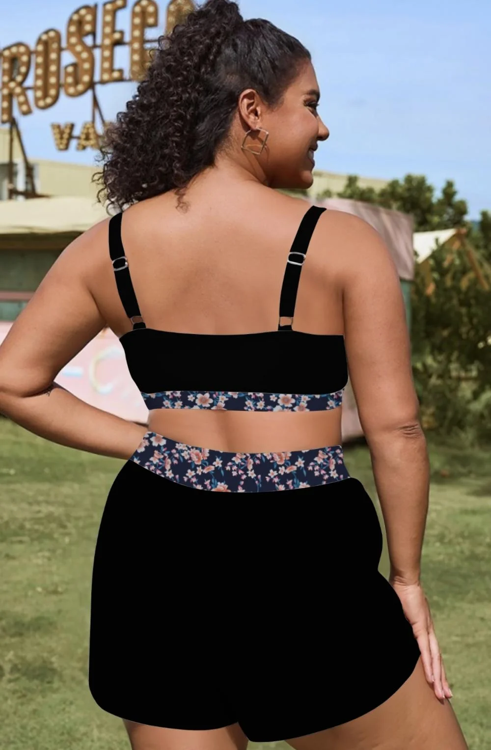 Plus Size Round Neck Golden Floral Patchwork Bikini Top