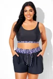Plus Size Round Neck Black Patchwork Bikini Top
