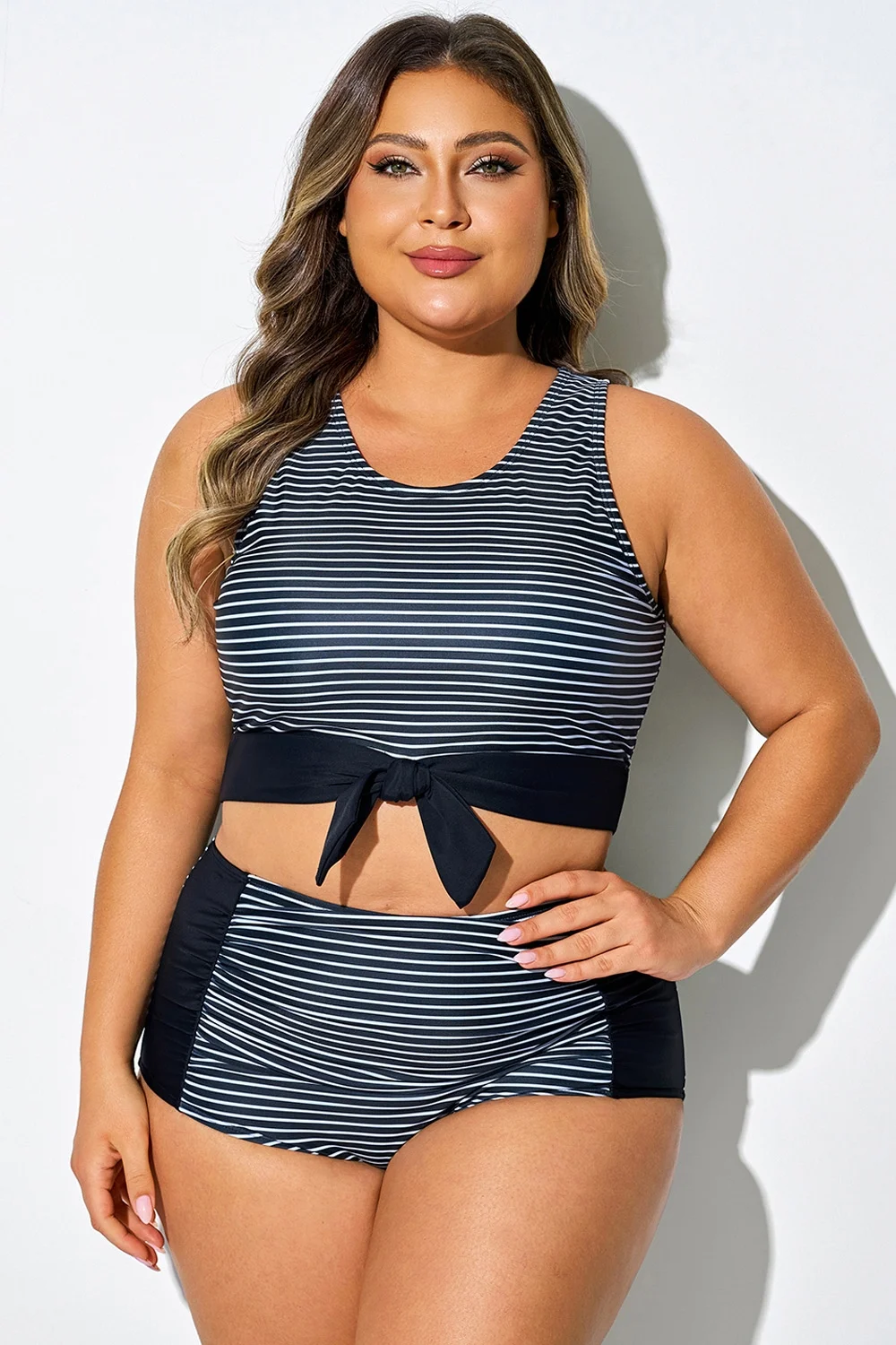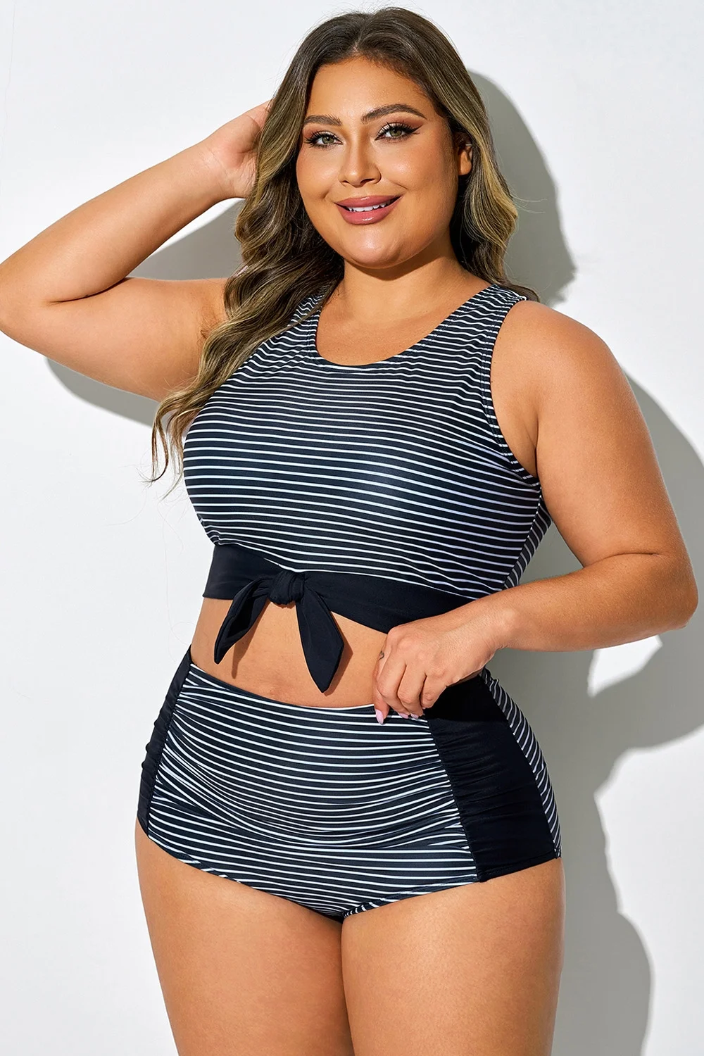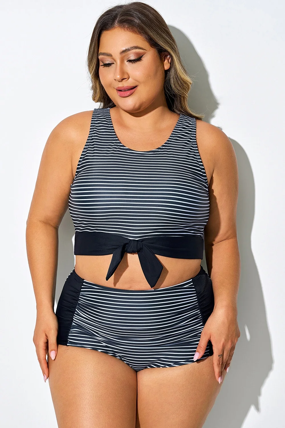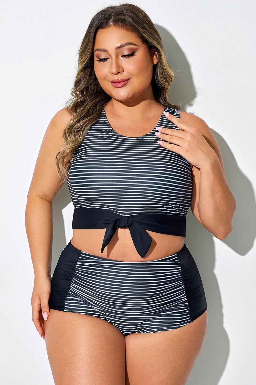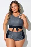 Plus Size Black Stripes Knotted Crop Bikini Top - PremCurve