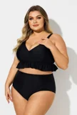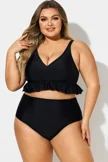 Plus Size Black V-Neck Ruffle Trim Bikini Top - PremCurve