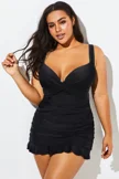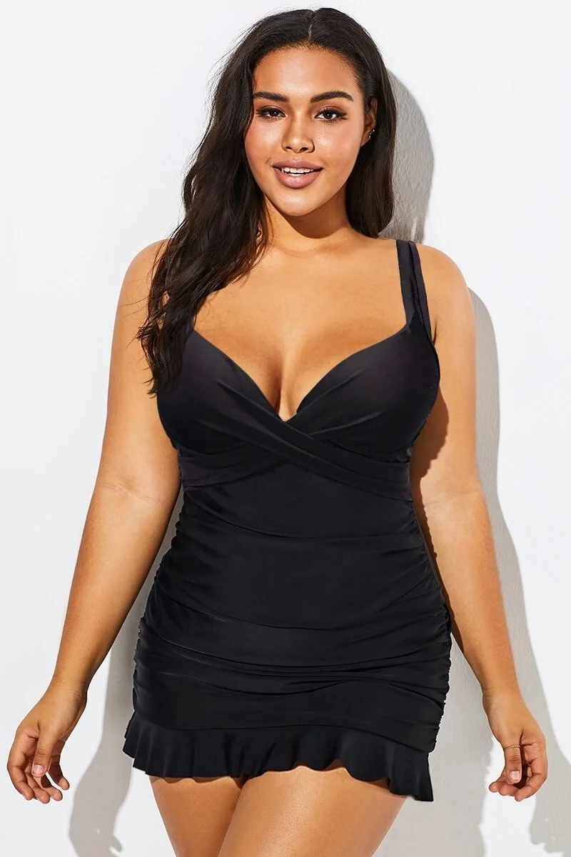 Plus Size Black V-Neck Twist Front Underwire Swimdress  - PremCurve