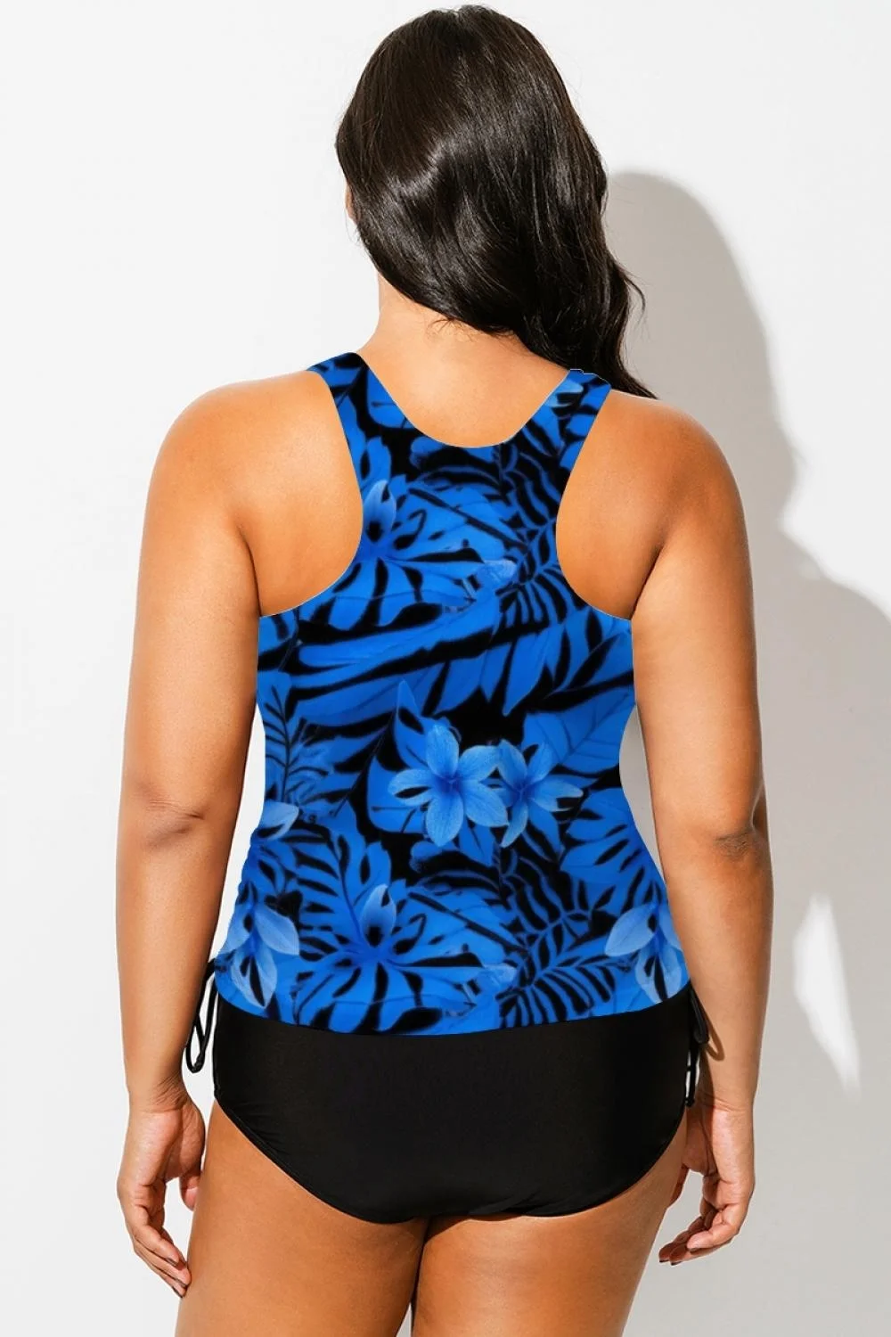 Plus Size Blue Floral Leaves Racerback Tankini Top - PremCurve