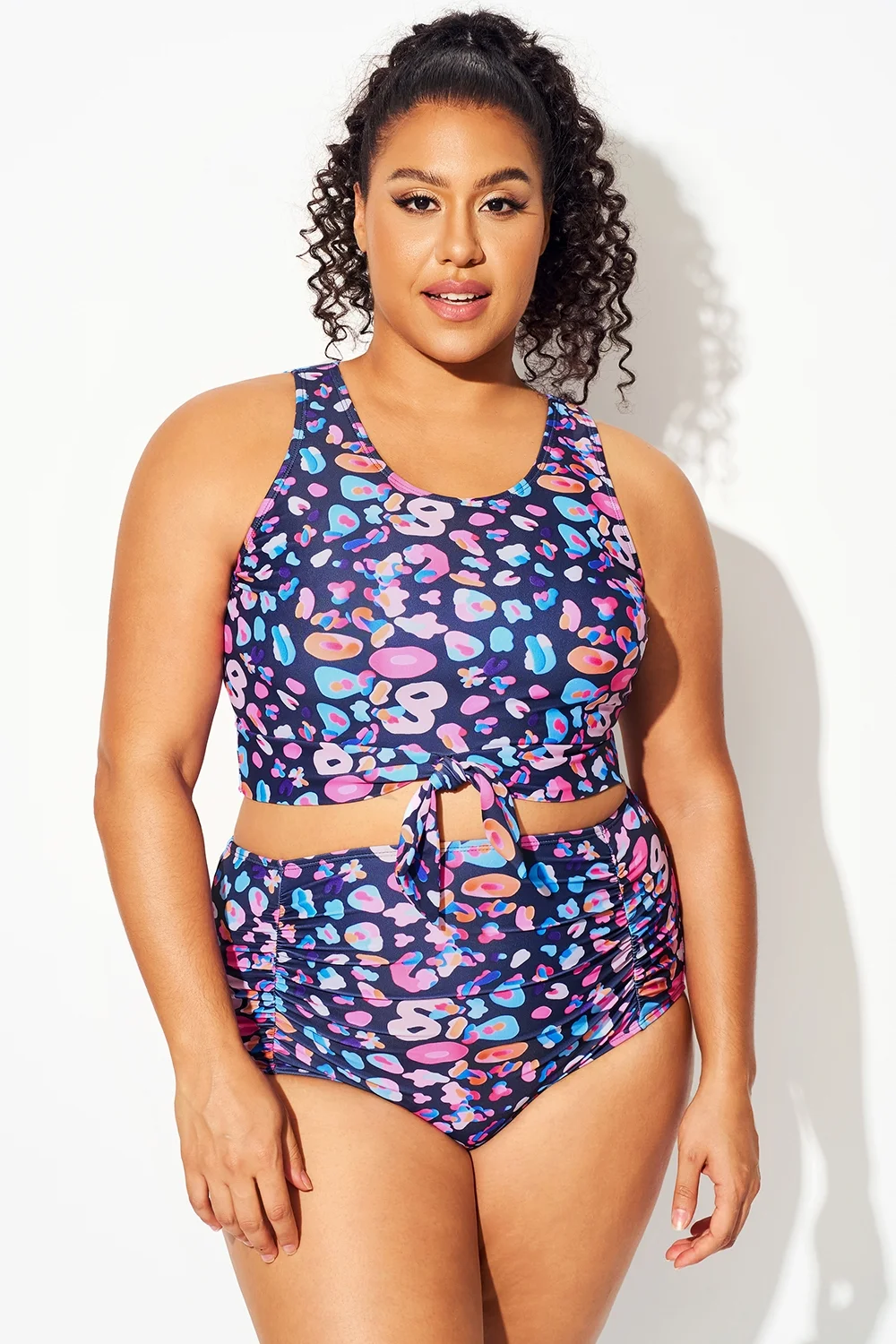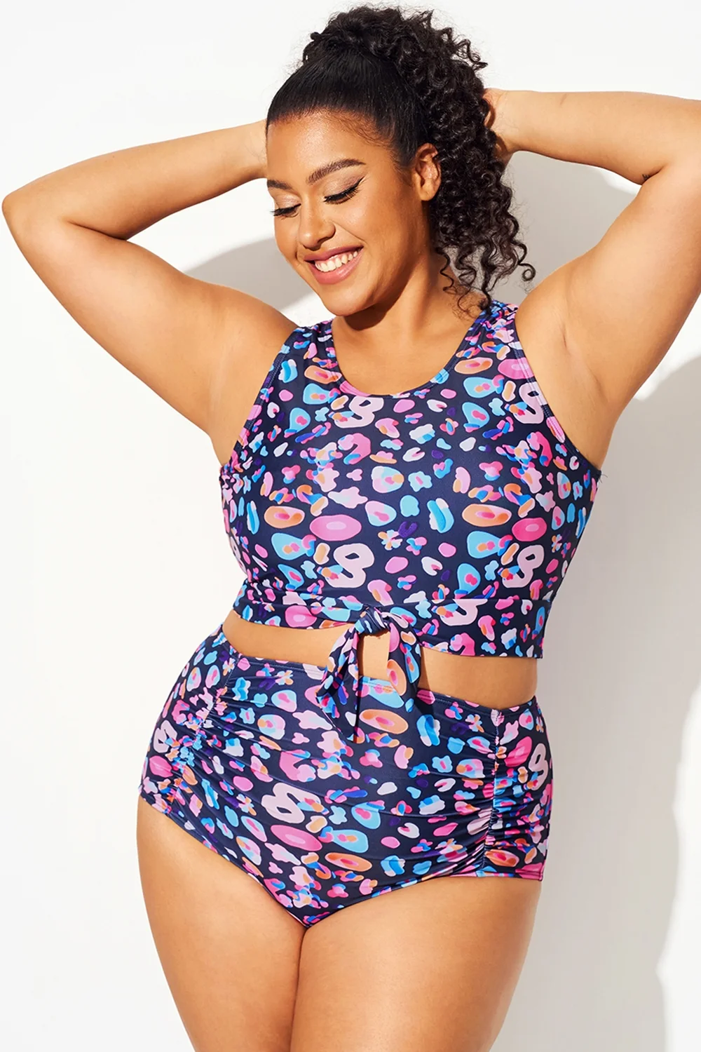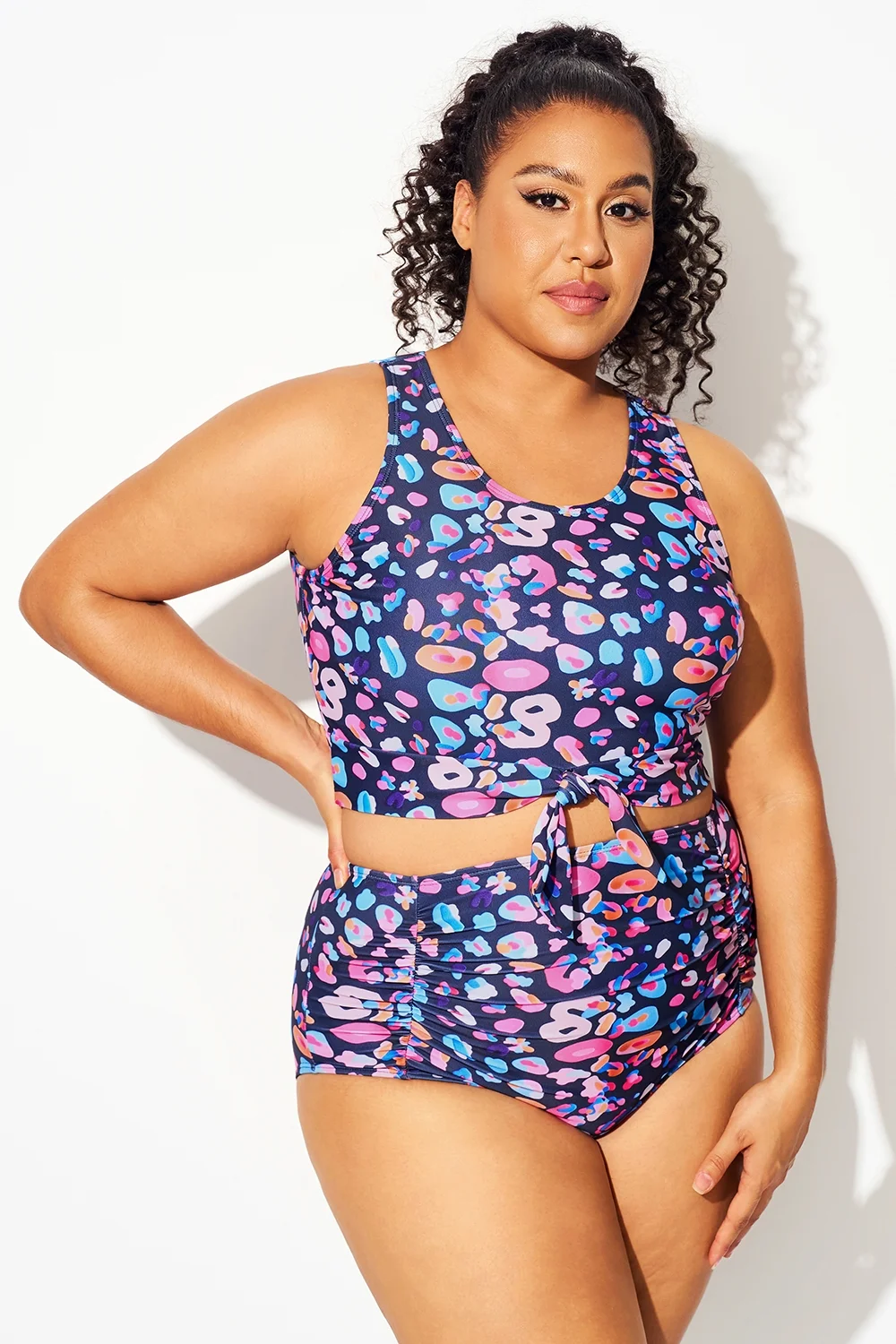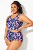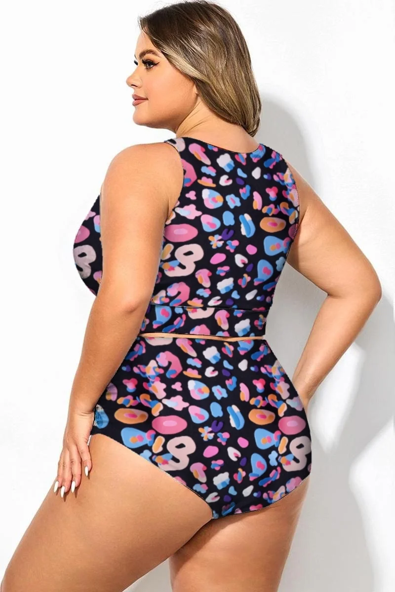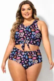Plus Size Round Neck Black Patchwork Bikini Top