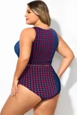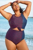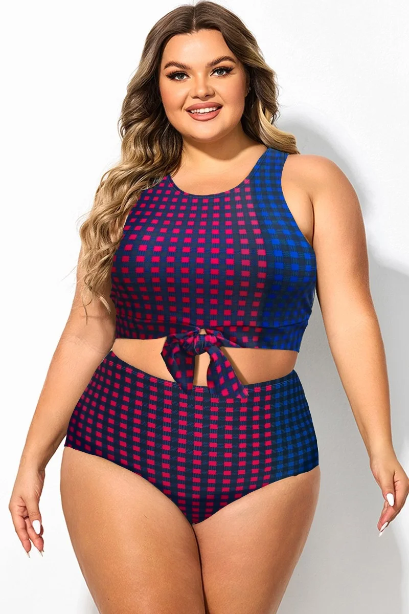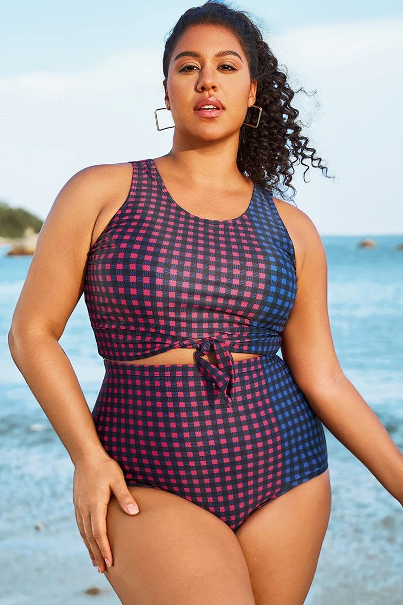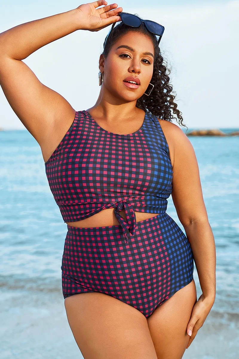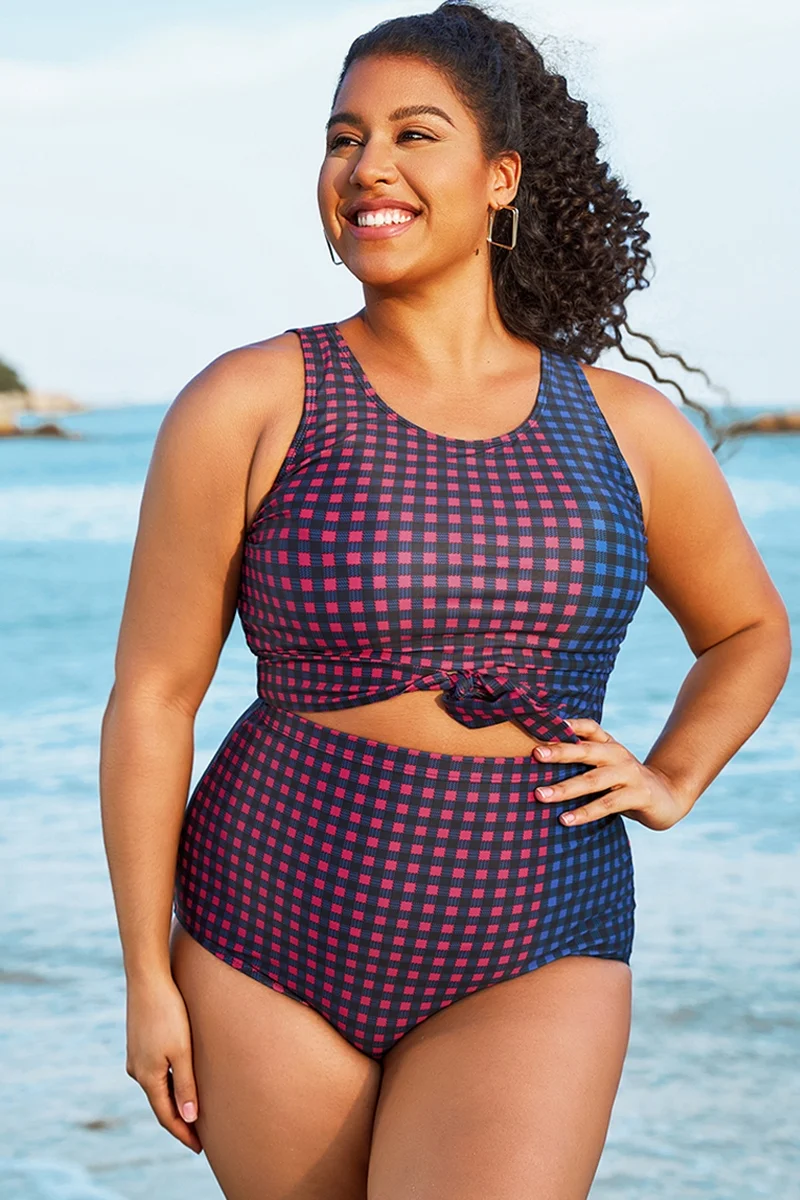 Plus Size Colorblock Check Knotted Crop Bikini Top - PremCurve