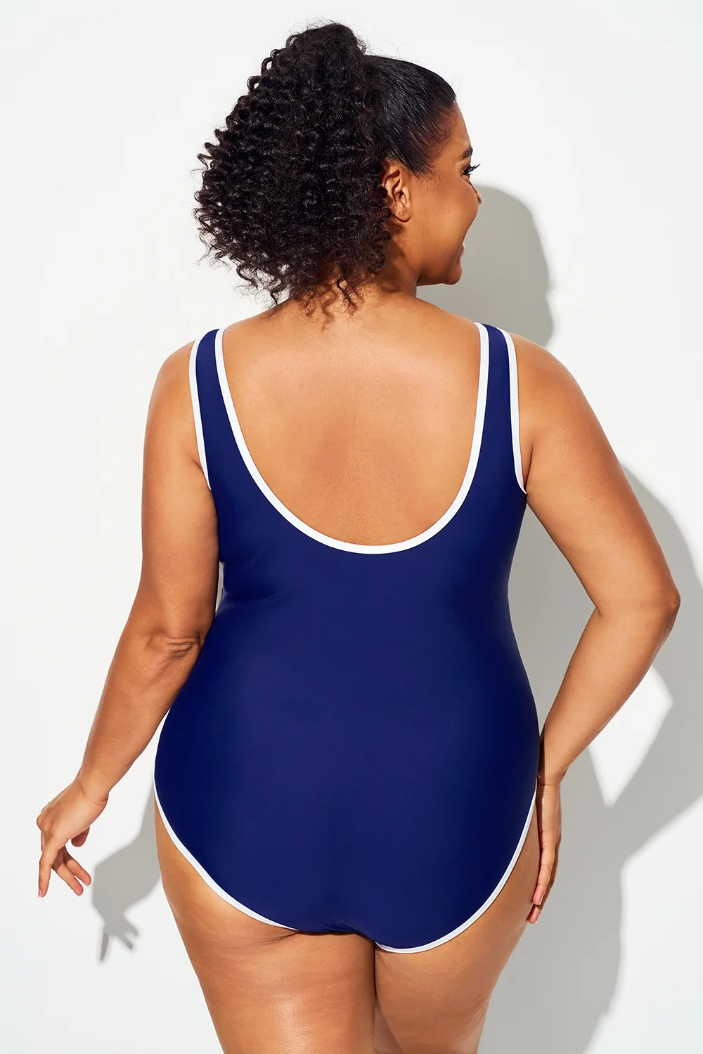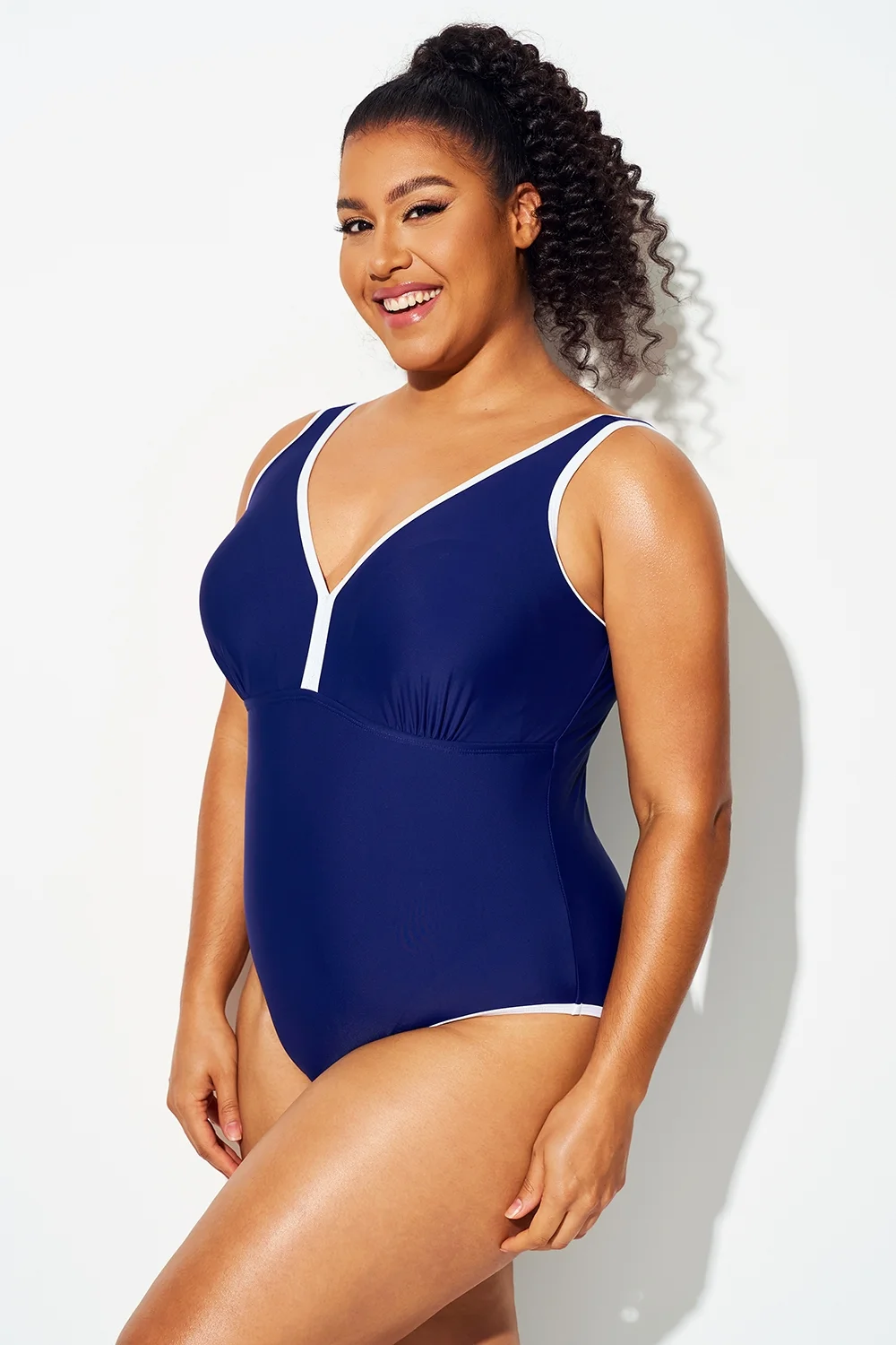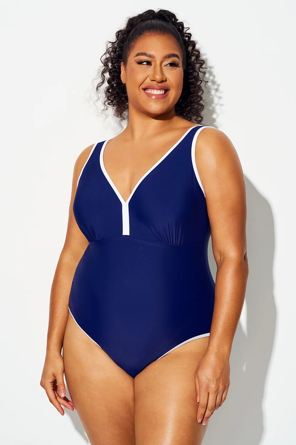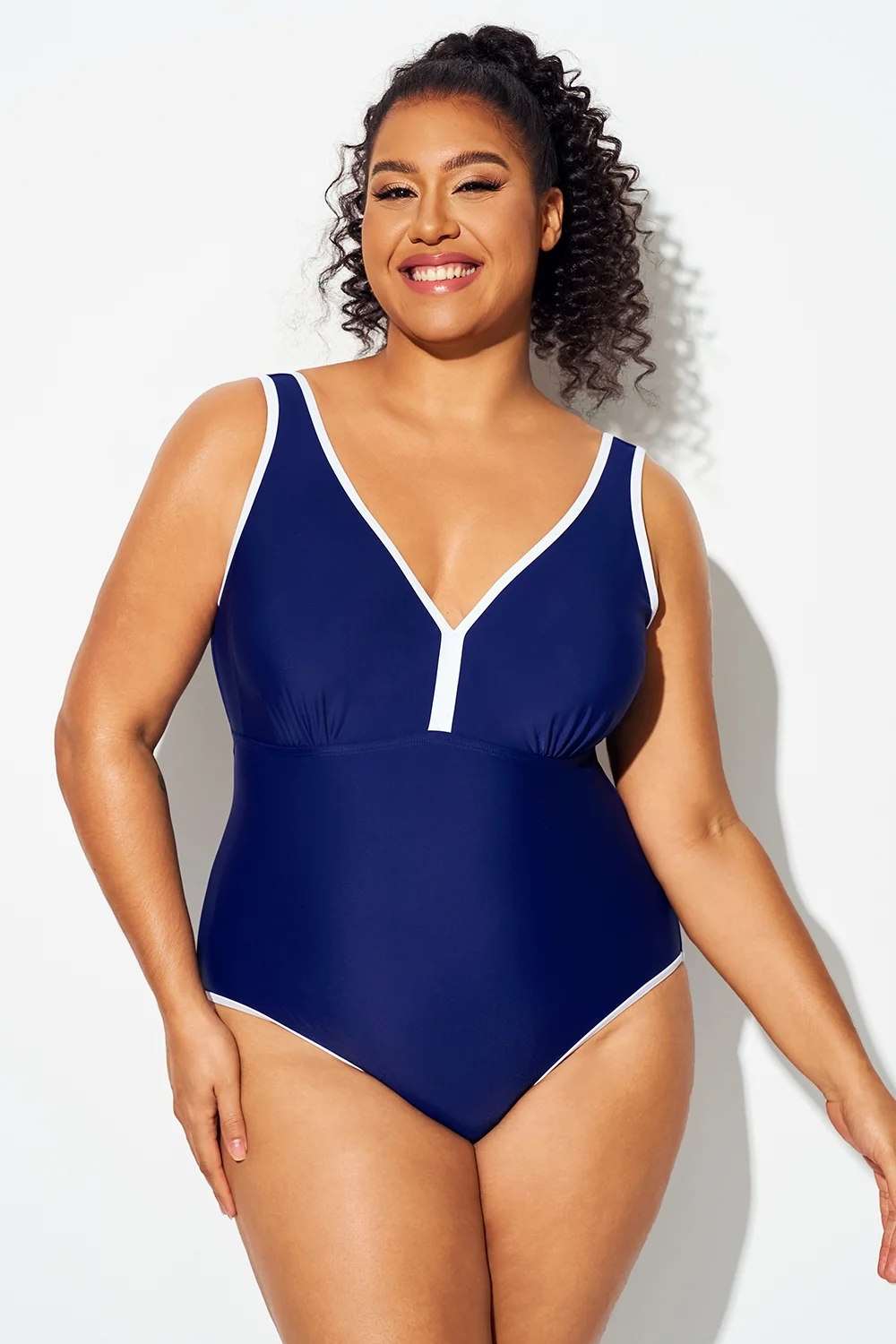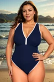 Plus Size Dark Blue Elegant V-Neck One Piece Swimsuit - PremCurve