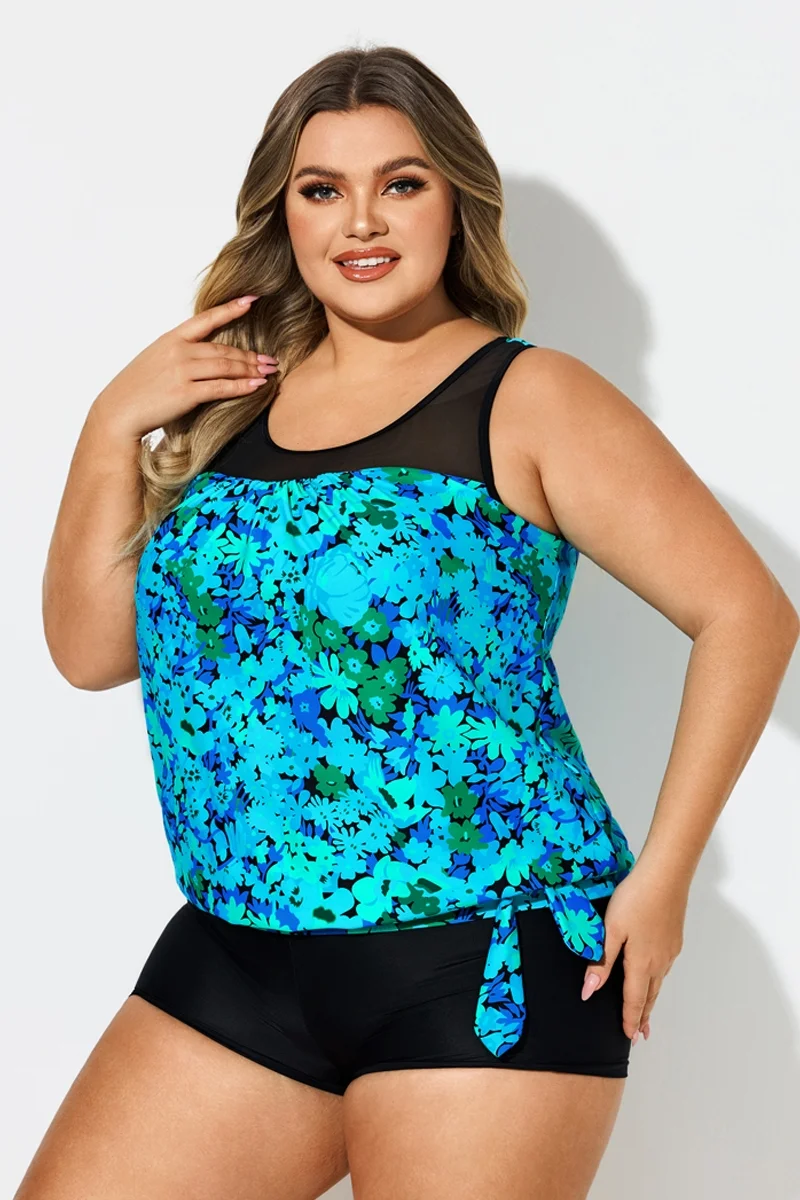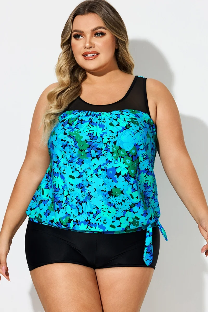 Plus Size Floral Print Mesh Cyan Tankini Top