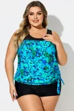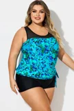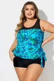 Plus Size Floral Print Mesh Cyan Tankini Top - PremCurve