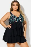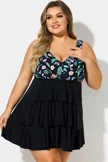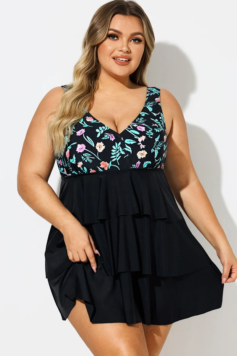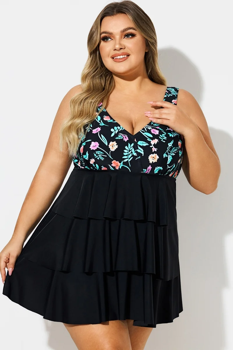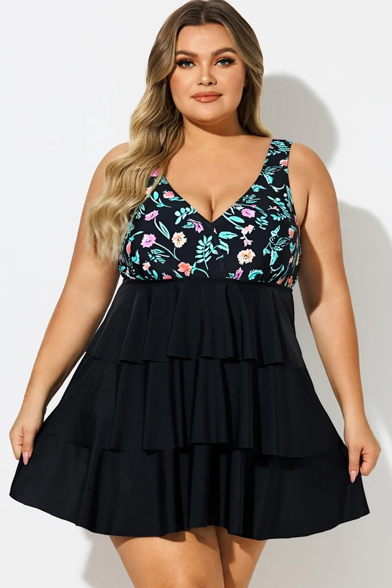 Plus Size Floral Print V-Neck Layered Swimdress