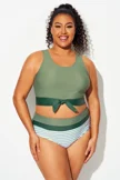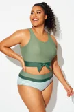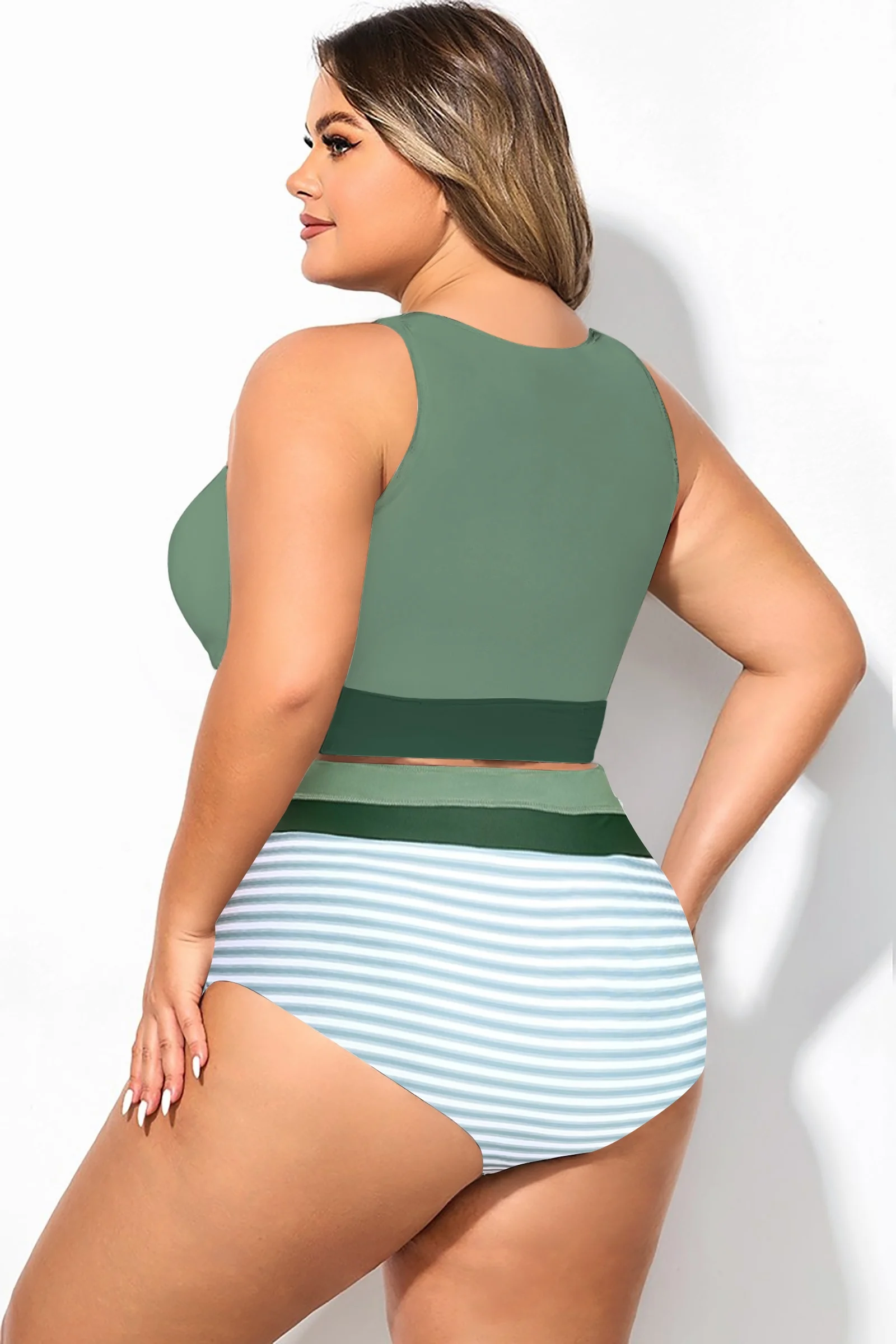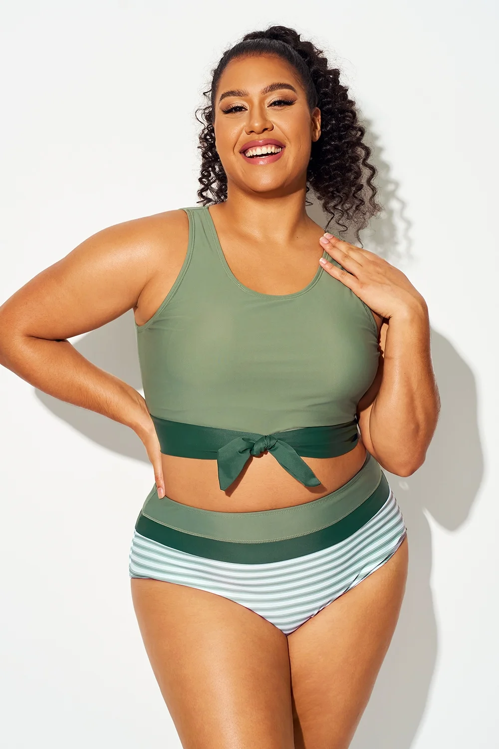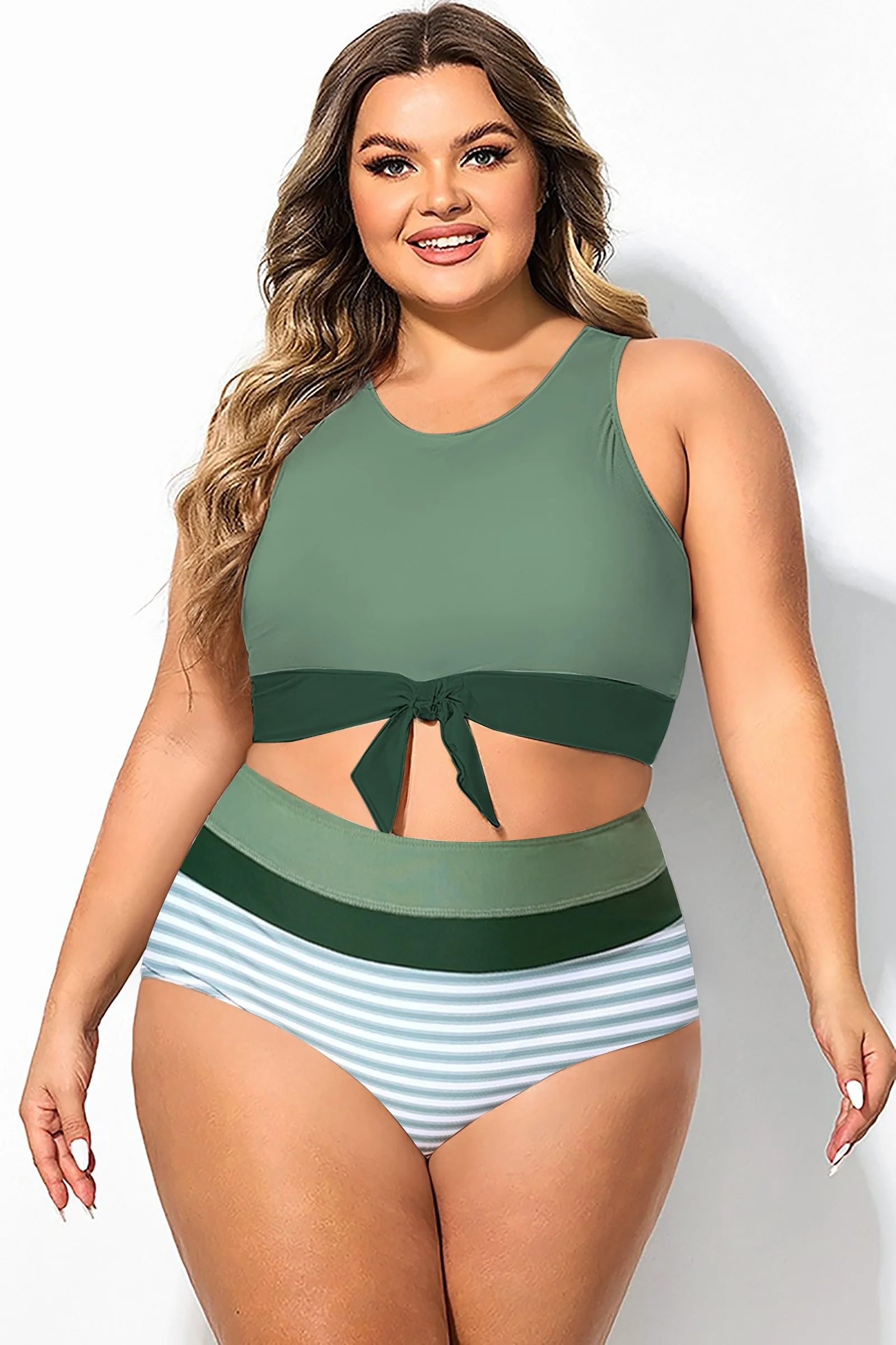 Plus Size Green Colorblock Knotted Crop Bikini Top - PremCurve