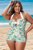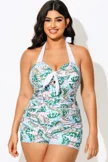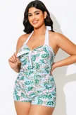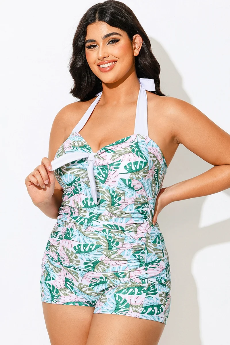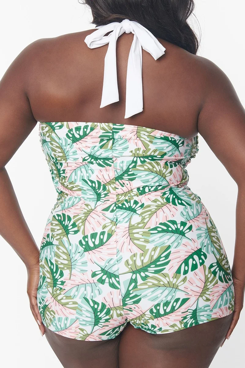 Plus Size Green Monstera Print One Piece Swimsuit