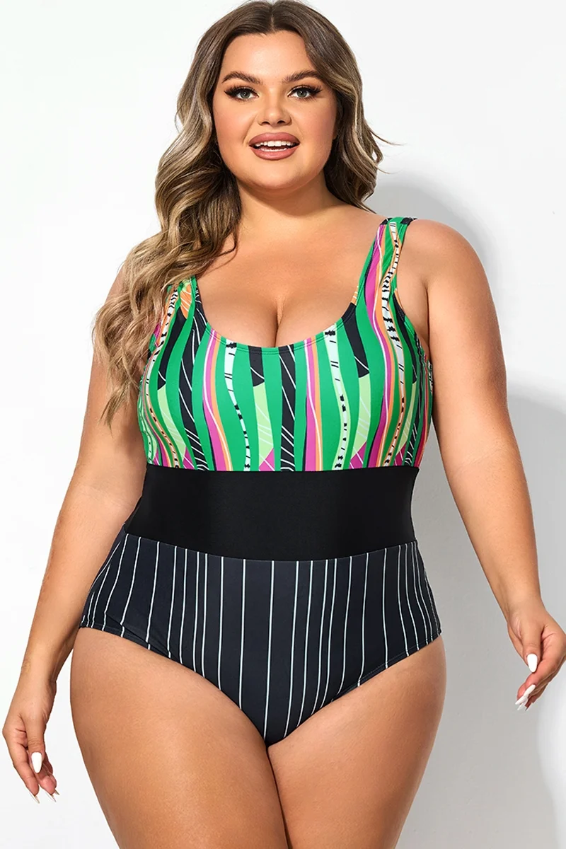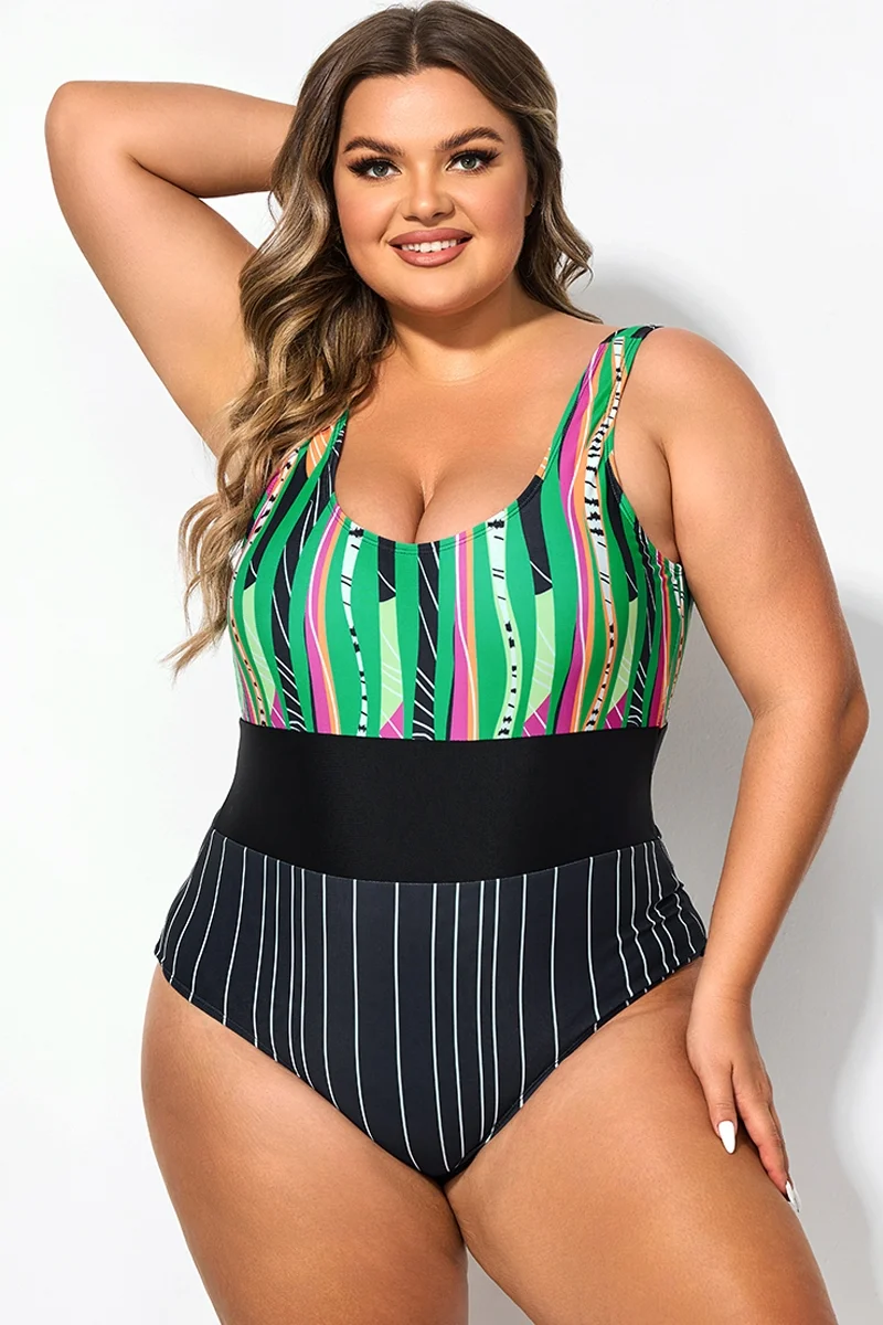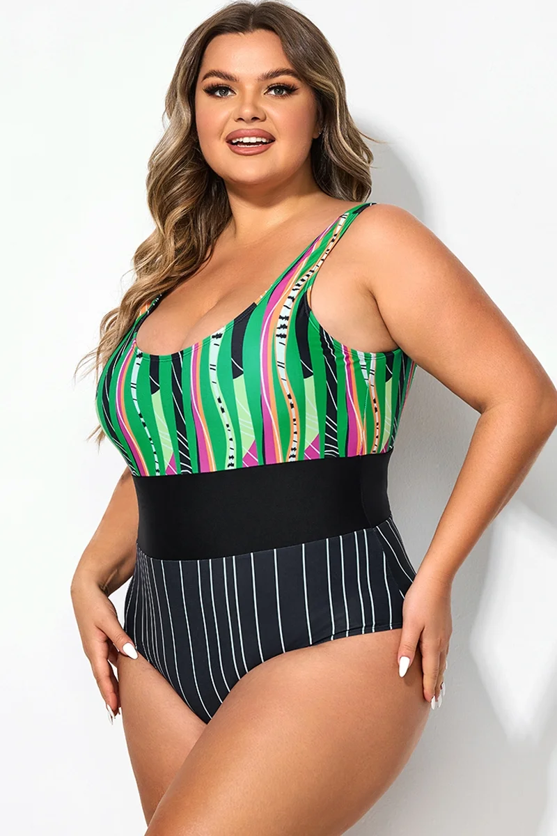 Plus Size Mixed Stripe Print One Piece Swimsuit - PremCurve